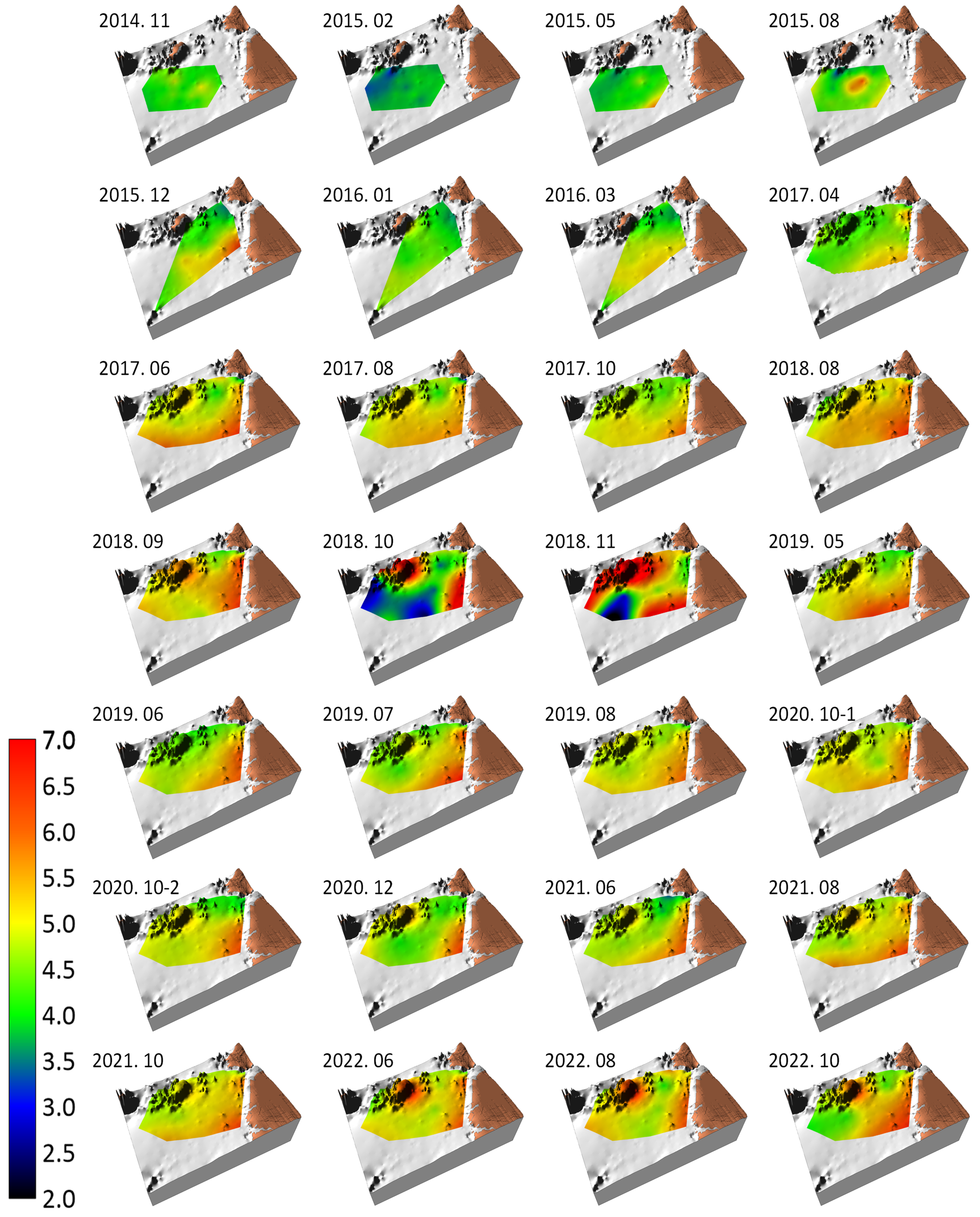 Benthic habitat map showing topography and spatiotemporal variation of the mean grain size (ϕ) of the bottom sediment of the study area from November 2014 to October 2022. The color palette on the left shows the mean grain size range from 2.0 to 7.0 ϕ.