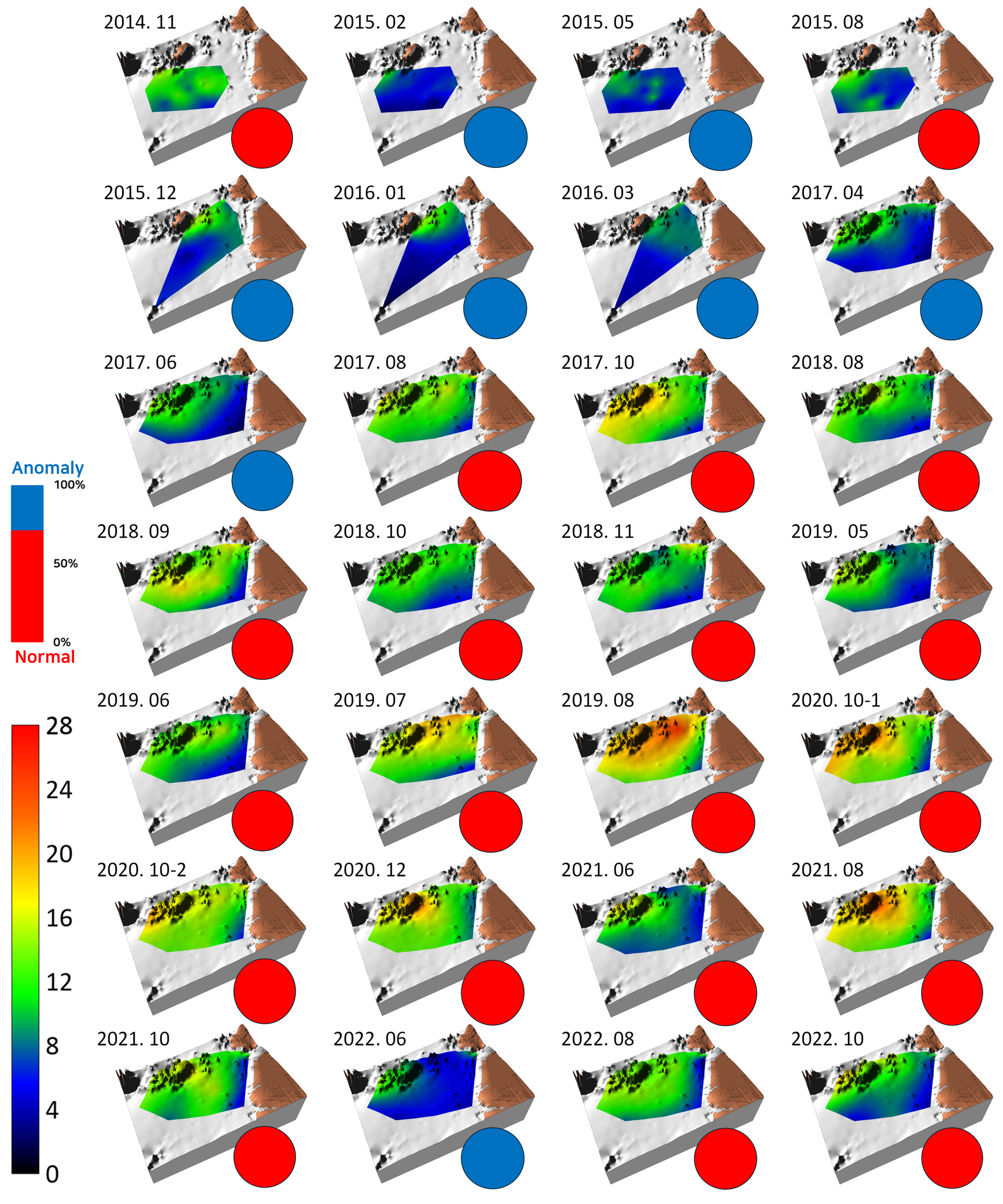 Benthic habitat map showing the topography, spatiotemporal variation in the diversity of macrobenthic communities (Whittaker’s d), and ratio of normal (red circle) vs. anomalous (blue circle) survey rounds observed in the study area from November 2014 to October 2022. The color palette on the left side shows the range of Whittaker’s d from 0 to 28, while the bar graph above it represents the proportion of normal to anomaly survey rounds.