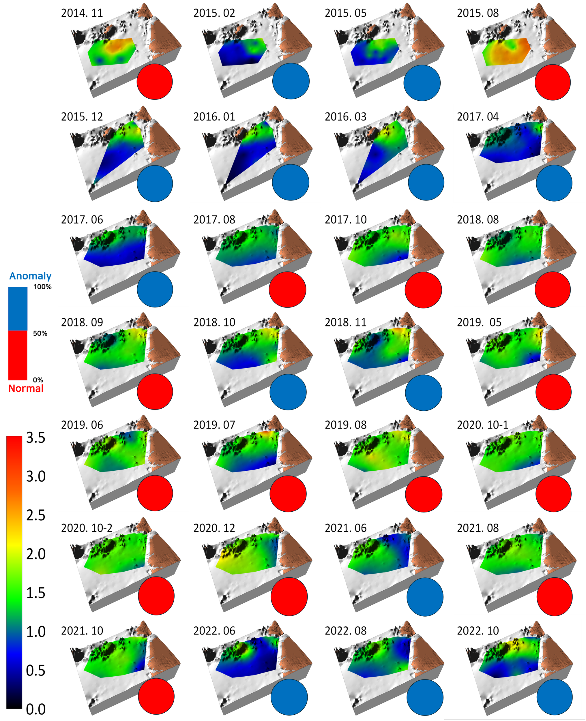 Benthic habitat map showing the topography, spatiotemporal variation of log-transformed wet weight, biomass of macrobenthic communities, and ratio of normal (red circles) vs. anomaly survey rounds (blue circles) observed in the study area from November 2014 to October 2022. The color palette on the left side shows the range of log-transformed biomass from 0 to 3.5, while the bar graph above it represents the proportion of normal to anomaly survey rounds.