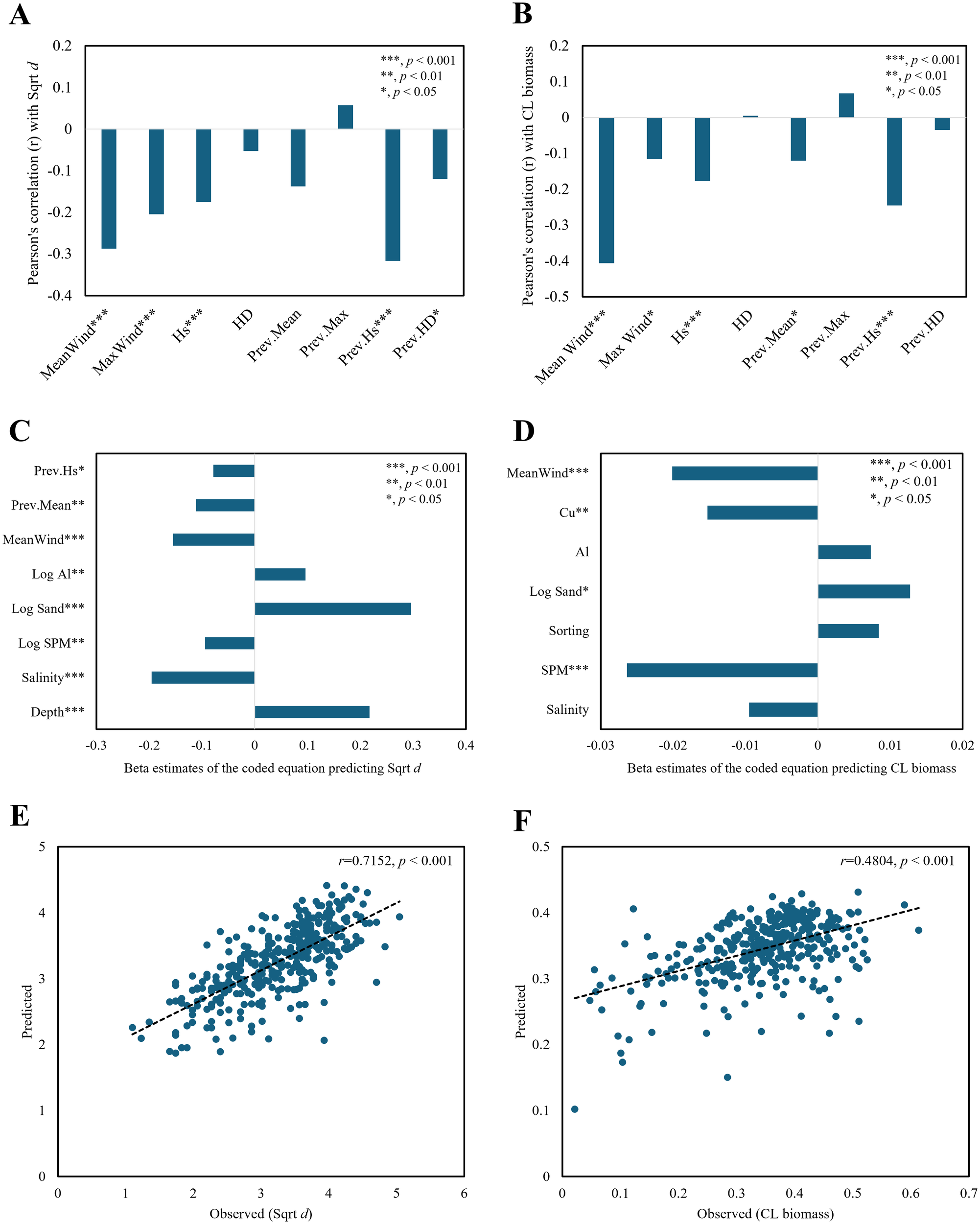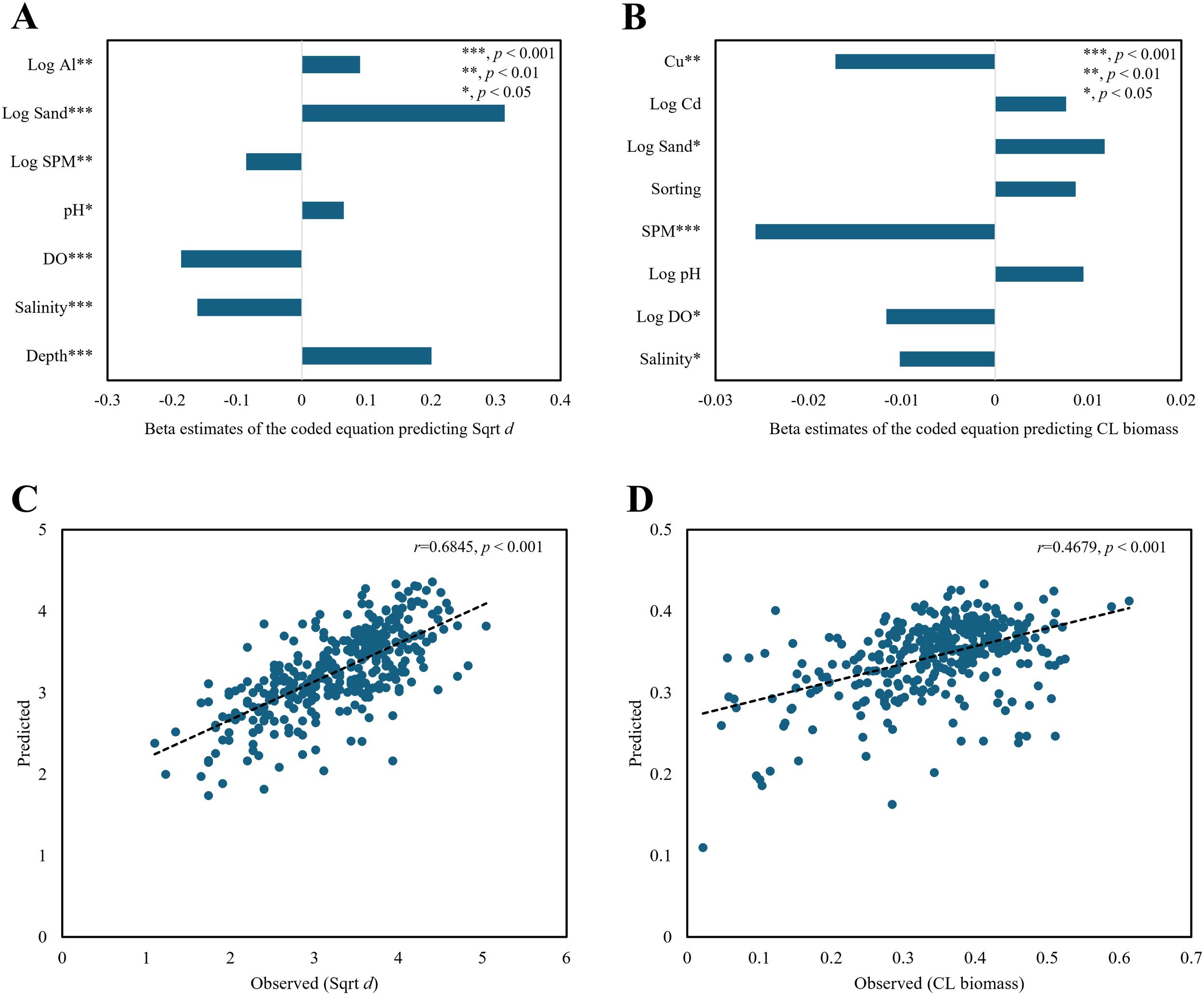 Regression plots of macrobenthic diversity with Sqrt d (square root-transformed Whittaker’s d) and CL biomass (consecutively log-transformed wet weight, g/m²) using sea predictors (bottom water/sediment variables). Beta estimates of the coded equations (A, B) and observed-predicted plots for the diversity and biomass regression models (C, D). Log indicates log-transformation for variable x (log (x + 1), base = 10), Al (sediment aluminum concentration), Sand (sand content), SPM (suspended particulate matter), pH (power of hydrogen), DO (dissolved oxygen), Cu (copper in sediment), Cd (cadmium in sediment), and Sorting (sediment sorting). Asterisks indicate statistical significance (*p < 0.05; **p < 0.01; *p < 0.001).
