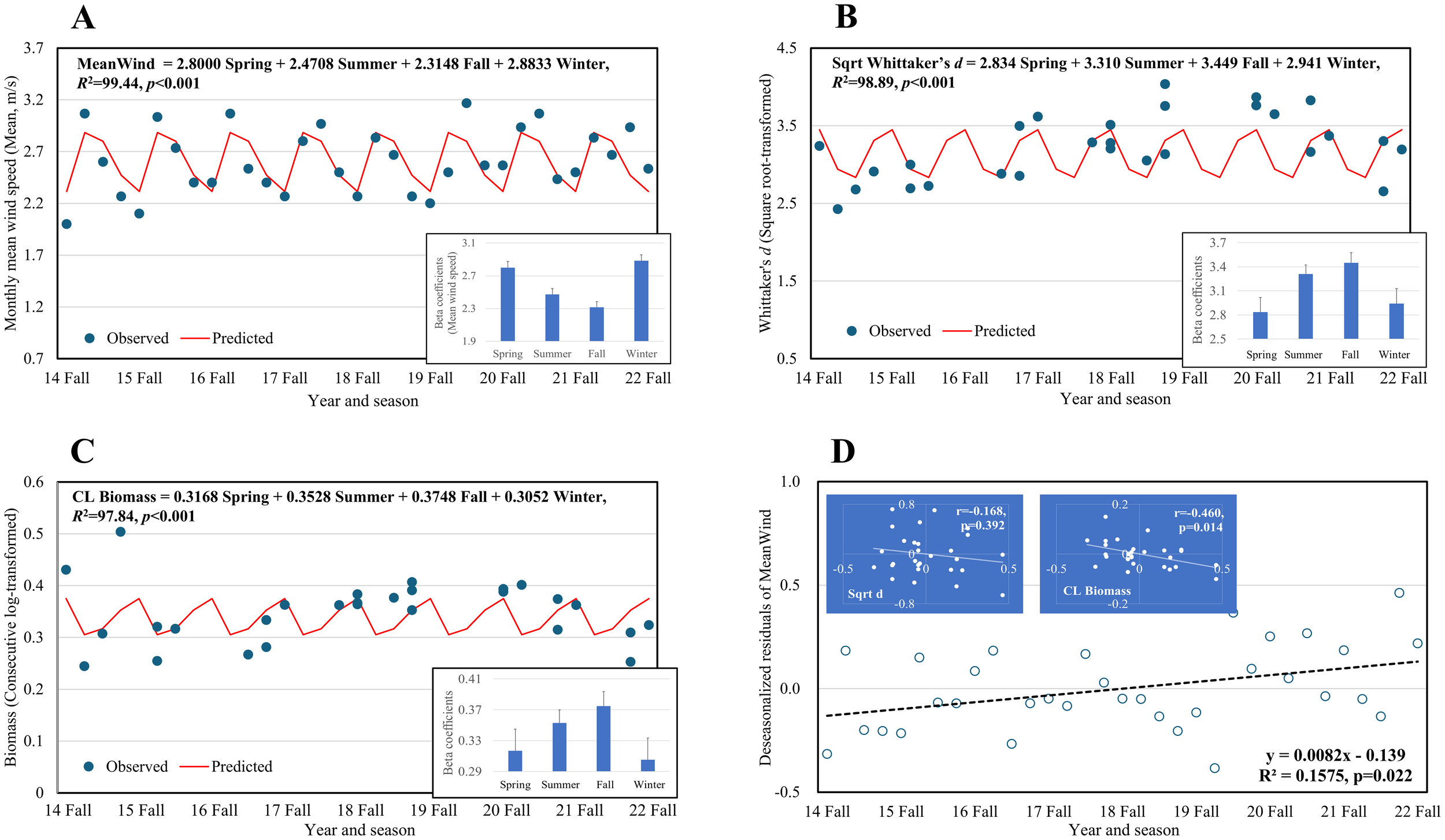 To understand the seasonal variations in biological parameters, we selected one of the air predictors based on the results of the regression analysis and estimated the seasonality of the predictor and biological parameters. We categorized the survey rounds into four seasons (spring = 1, summer = 2, fall = 3, and winter = 4), and applied a seasonal mean model, expressed as follows: