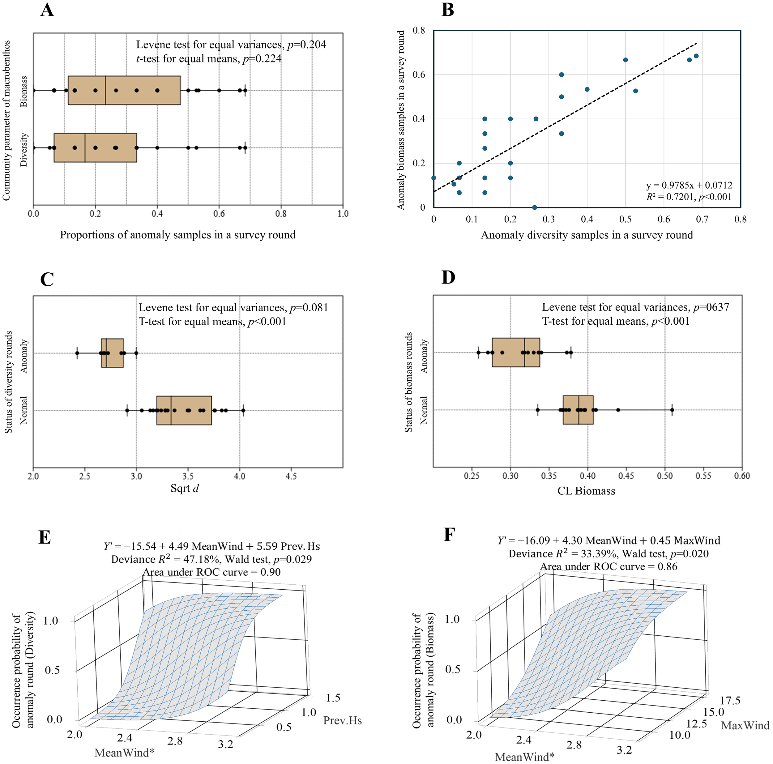 We predicted the conditions of occurrence for the anomaly survey round (proportion of anomaly samples per a survey round ≥33%) using multiple logistic regression with air predictors. In the analysis, the response variables, namely, survey rounds, were coded as 1 for anomalies and 0 for normal responses. Prior to analysis, the linear relationship between the proportion of anomalous samples per survey round of diversity and biomass was estimated. Thereafter, we examined the differences in the proportions of anomaly samples in a survey round based on diversity vs. biomass and the differences of each parameter between anomaly vs. normal using a Spear style boxplot without upper and lower fence (upper and lower quartile ± 1.5 interquartile range). The Levene’s test for equal variances and t-test for equal means were performed to test for statistical differences.