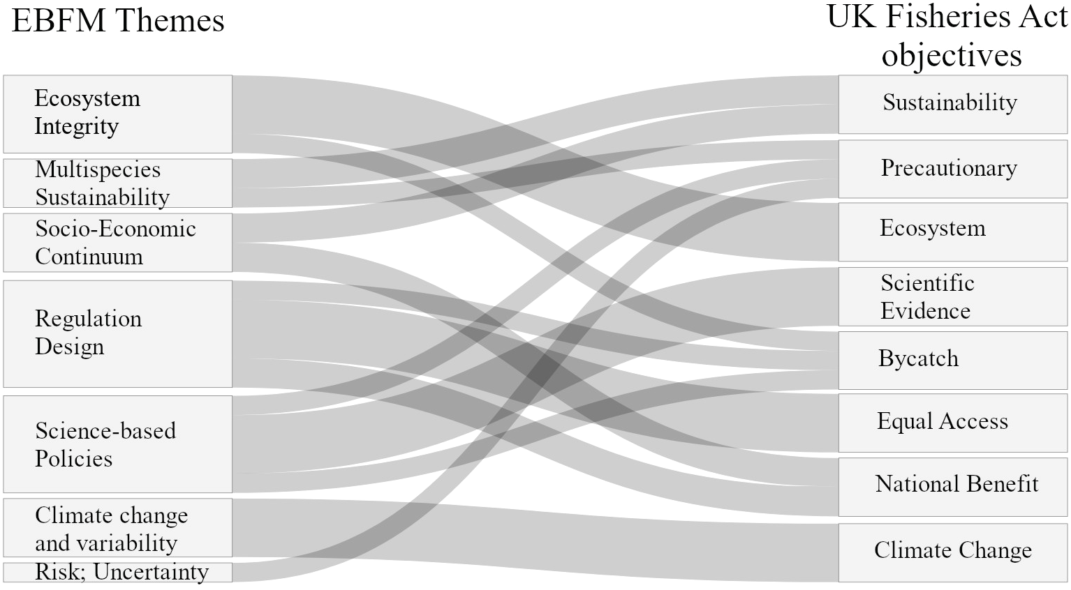Commonalities between the objectives defined by the Uk Fisheries Act (right) and the themes we identified as representing the scientific view of EBFM (left). The linkages identify which of the scientific definitions and Fisheries Act objectives share some common grounds. Links are unweighted and Equi proportional to the UK fisheries objectives (i.e.: if a UK fisheries objective treats topics contained in three different scientific definitions, then the ribbons departing from this UK objectives weights 0.33).
