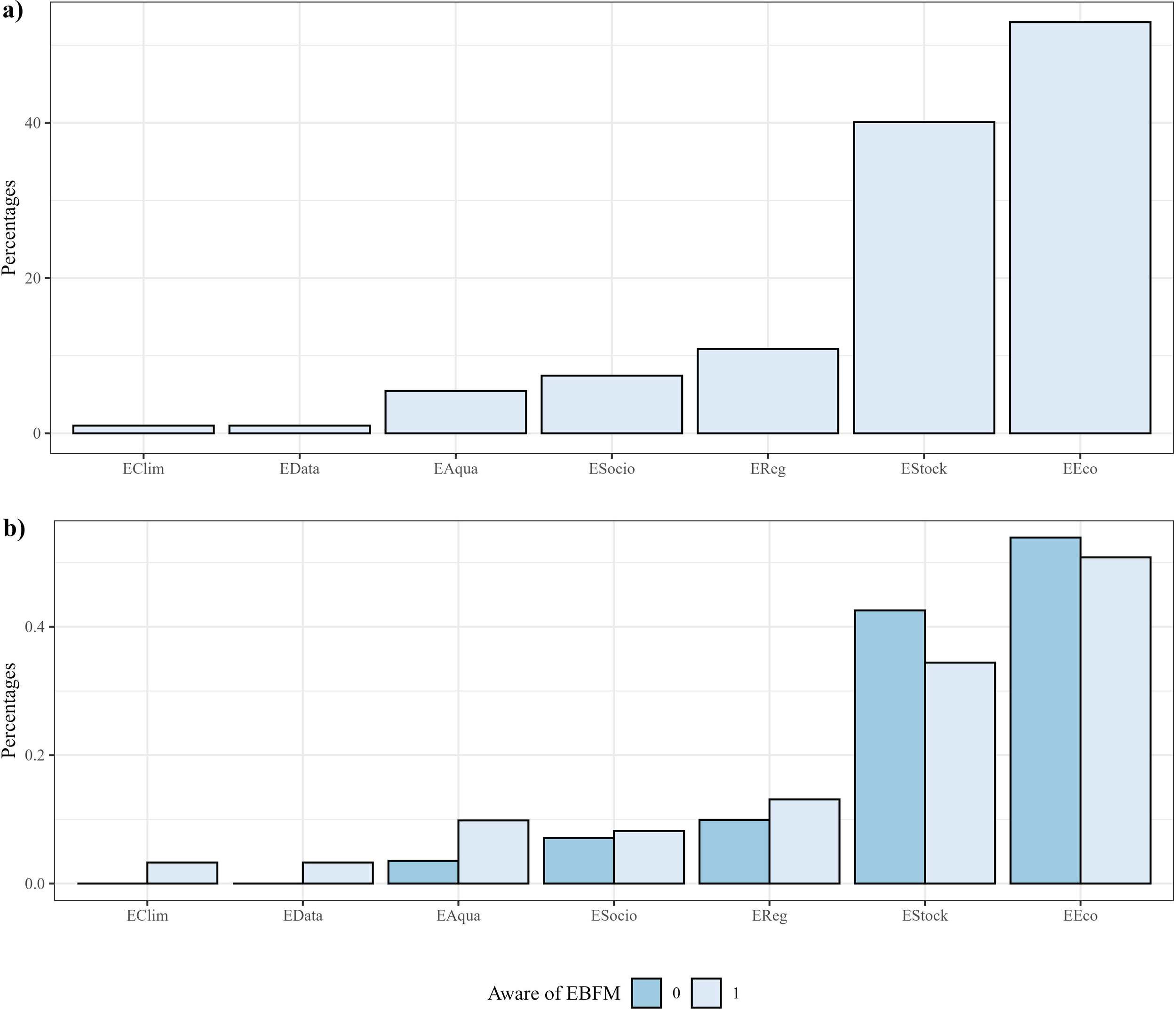 We then followed a process of open coding inspired by Grounded Theory (Charmaz, 2001), classifying answers into a set of seven themes that emerge from the data, namely fish stocks, environmental conservation, use of science/data, socio-economic aspects, regulation design, climate change, and aquaculture. The answers were coded by each author of this publication separately. Subsequently the authors discussed any discrepancies in the coding and reached consensus. This coding process yielded a set of (binary) variables, namely EStock (fish stocks), EEco (ecosystem integrity), ESocio (socio-economic aspects), EReg (regulation design), EAqua (Aquaculture), EClim (climate change), and EData (use of science/data), representing each of the seven themes. A value of 1 was given whenever the contents of the statement pertained to a particular category, and 0 when it did not. A single answer could pertain to one or more categories, and is coded accordingly (See Table 4).
