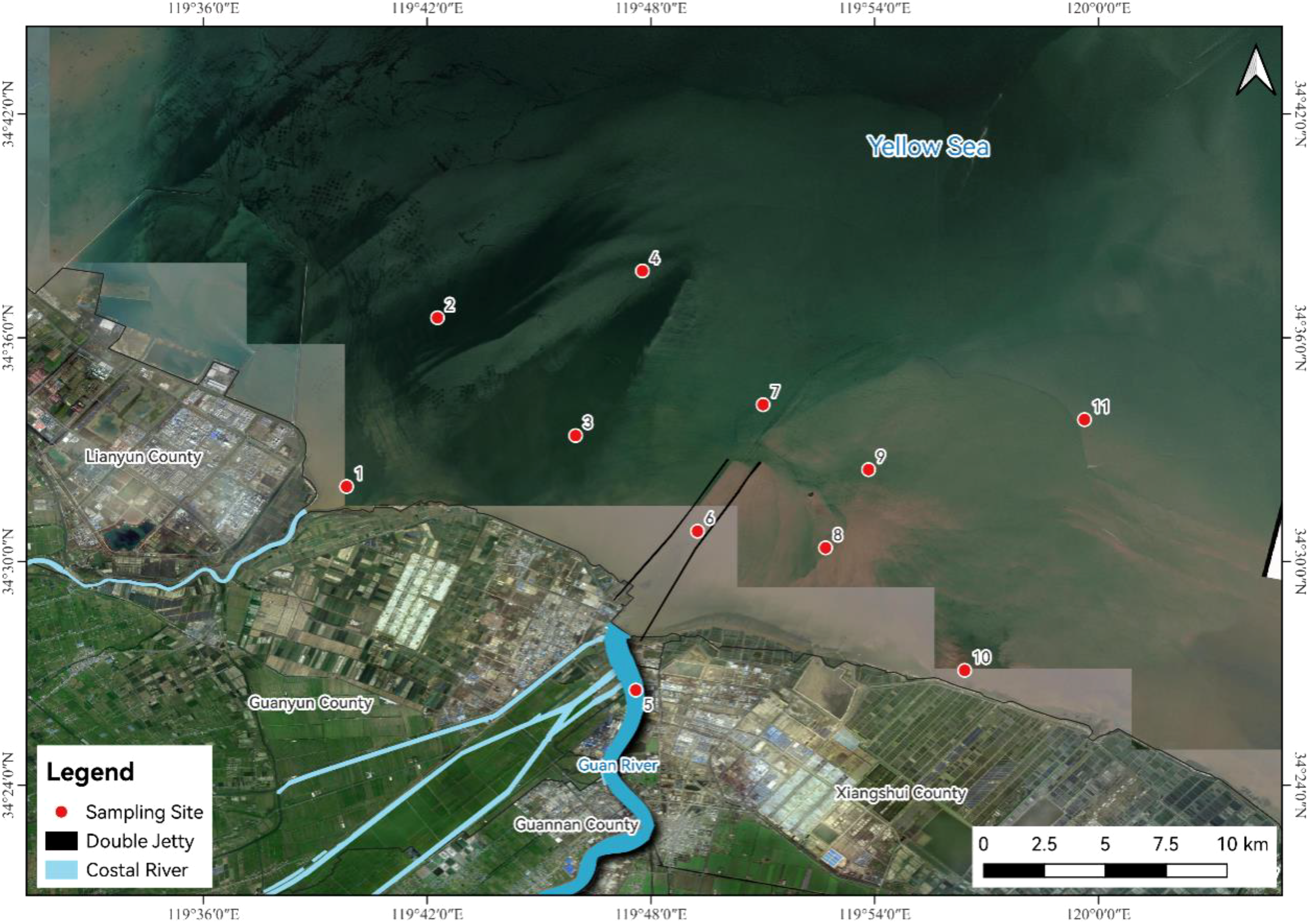The underwater topography of the sea around the Guan River Estuary varies greatly, with the main geomorphological types including underwater shoals and seabed residual sand plains. The sea area to the east of the Guan River Estuary is dominated by scouring, while that to the west exhibits both scouring and silting. The surface sediments are classified into two main types, namely, clayey silt and sandy silt, which are generally distributed as fine sediments nearshore and coarse sediments offshore (Ding et al., 1993; Chen et al., 2006).