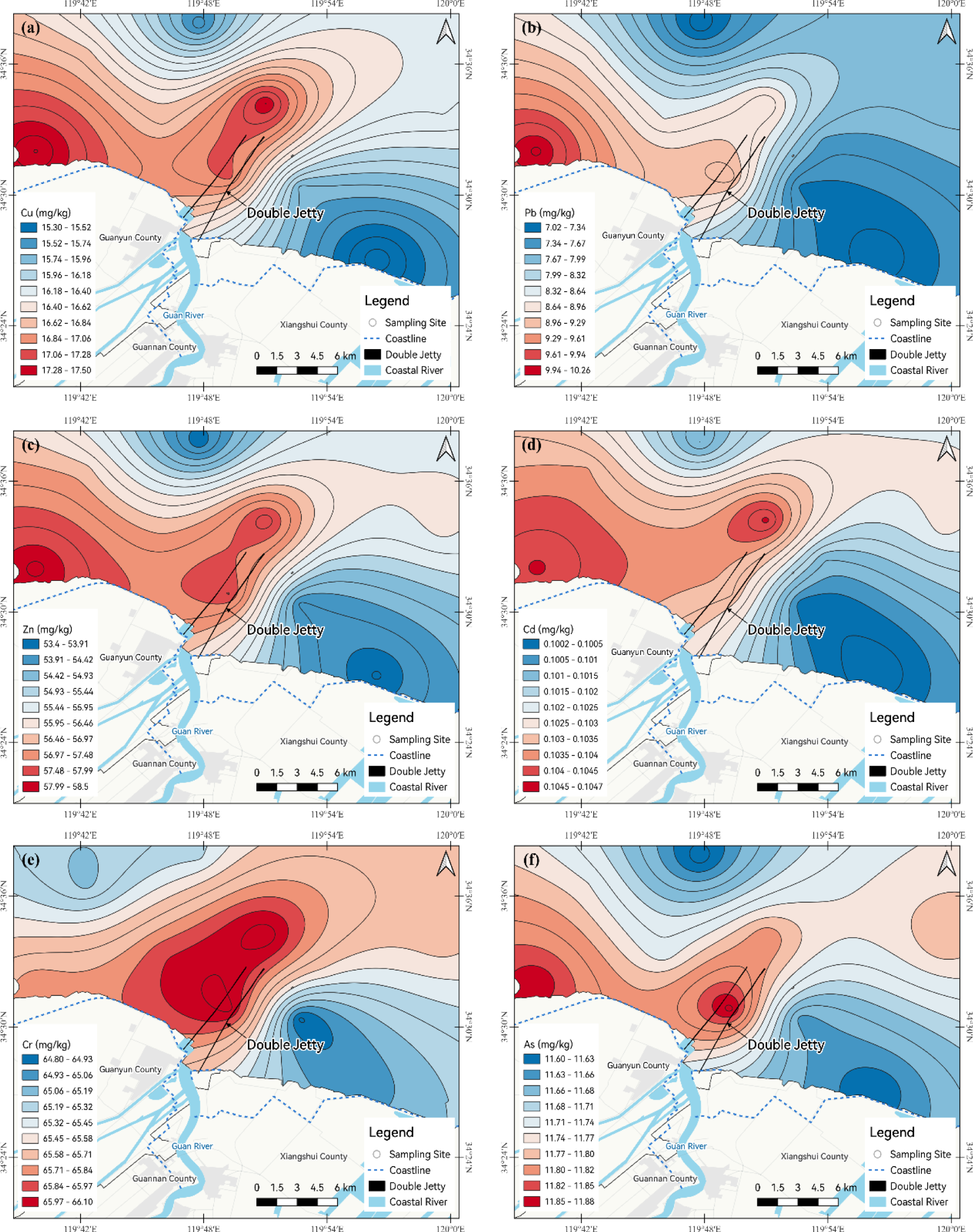 Spatial distribution of (a) Cu, (b) Pb, (c) Zn, (d) Cd, (e) Cr, and (f) As in the surface sediments of the Guan River Estuary(mg/kg).