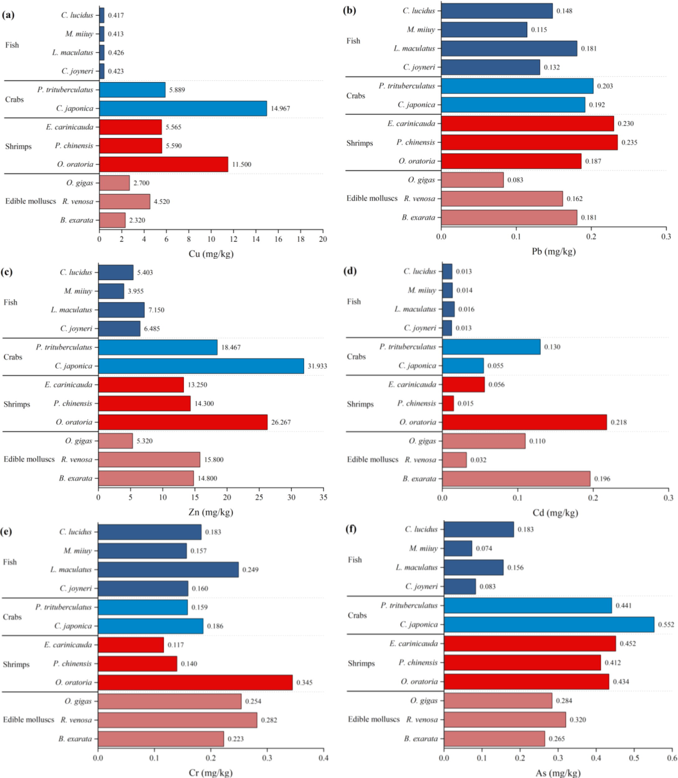We identified 12 common marine organisms in the Guan River Estuary, including four fish species (Collichthys lucidus, Miichthys miiuy, Lateolabrax maculatus, and Cynoglossus joyneri), two crab species (Portunus trituberculatus and Charybdis japonica), three shrimp species (Exopalaemon carinicauda, Penaeus chinensis, and Oratosquilla oratoria), and three edible molluscs species (Ostrea gigas, Rapana venosa, and Bullacta exarata). Table 5 and Figure 3 present the concentrations of heavy metals found in the muscle tissues of these 12 studied organisms (mg/kg wet weight).