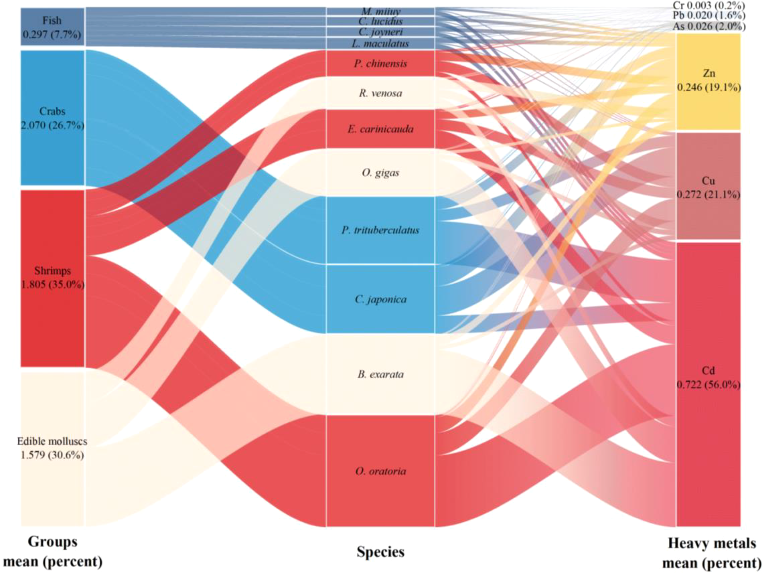 The samples were transported to Jiangsu Yunfan Testing Technology Co., Ltd. (a certified testing institution for heavy metals). Under dust-free laboratory conditions, the sediment samples were air-dried at room temperature to eliminate any remnants of flora and fauna. The samples were then pulverized using an agate pestle and mortar, and sieved through a 96-micron nylon mesh. After biological identification of the marine organisms, the muscle tissues of the fish, crabs, shrimps, and edible molluscs were ground with a tissue homogenizer, dried at a low temperature, and ground into a powder through 154-μm nylon mesh.