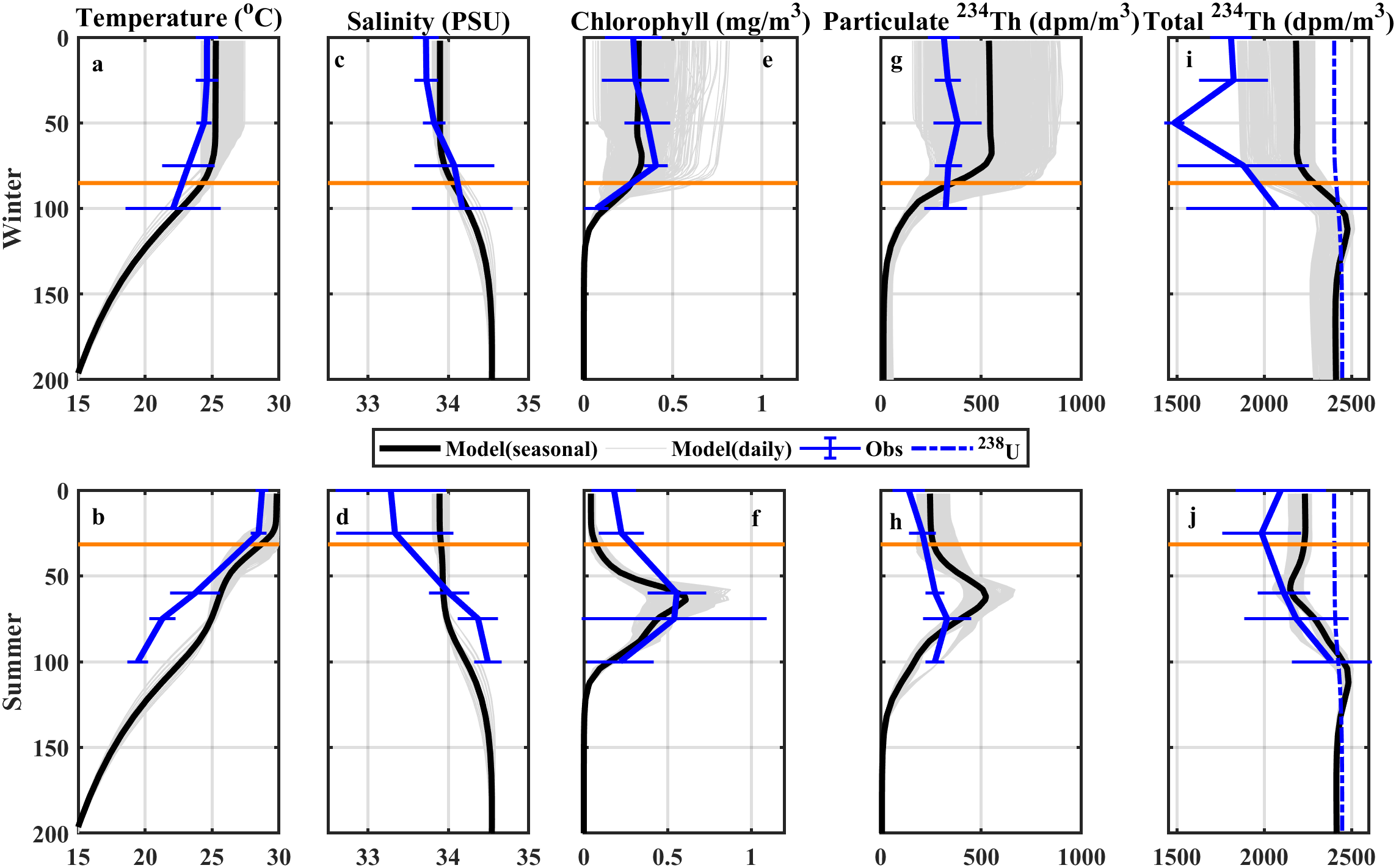 In situ and model-simulated vertical profiles of (a, b) temperature, (c, d) salinity, (e, f) chlorophyll, (g, h) particulate 234Th, and (i, j) total 234Th in (a, c, e, g, i) winter and (b, d, f, h, j) summer at the SEATS site. Black and gray solid lines represent the seasonal mean and daily vertical profiles of the model outputs, respectively. Blue solid lines are the in situ profiles with standard deviations. The horizontal lines indicate the mixed layer depth.