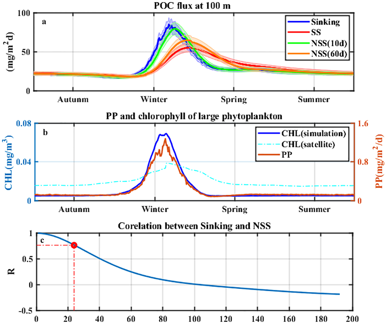 (a) Seasonal POC export flux at 100 m for (blue) Sinking, (red) SS, (green) NSS (10 days), and (orange) NSS (60 days) from simulations at SEATS. The shaded area is the 10% error for each curve. (b) Seasonal distributions of (blue) surface chlorophyll for large phytoplankton, (orange) 0–100 m integrated primary production for large phytoplankton from model outputs, and (cyan) satellite-derived surface chlorophyll of micro-sized phytoplankton. (c) Correlation coefficients of the Sinking and NSS-derived POC flux at 100 m as a function of the time interval (Δt) for estimating the NSS-derived flux. The vertical dotted line represents the half-life of 234Th.