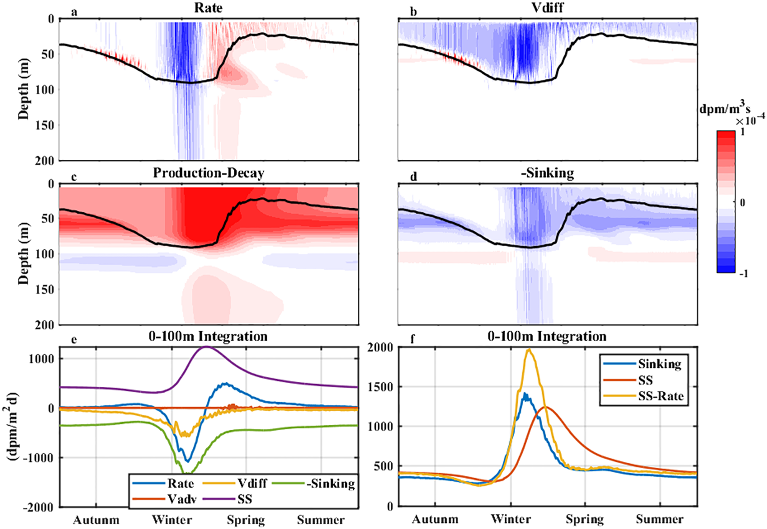 The seasonal cycle of each term in Equation 1 from simulations at SEATS. Vertical distributions of (a) the change rate over time (Rate), (b) vertical diffusion term (Vdiff), (c) radioactive production-decay of 234Th (Production-Decay), and (d) the particle sinking term (Sinking). The black lines in parts (a–d) are the mixed layer depths. (e) 0–100 m integrations of (blue) the Rate, (orange) Vdiff, (purple) radioactive production-decay (SS), and (green) the Sinking terms. (f) 0–100 m integrations of (blue) the Sinking term, (red) the radioactive production-decay term (SS), and (orange) the term of (SS-Rate).