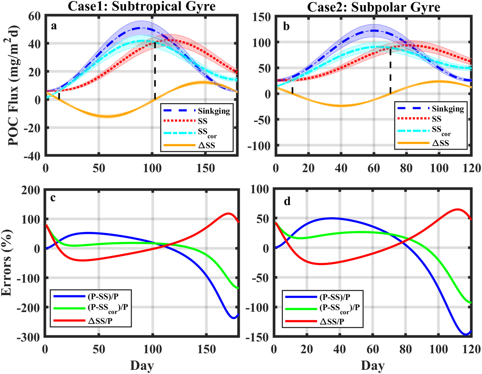 (a, b) Temporal variations in POC export flux derived from (blue) Sinking and (red) SS, (cyan) modified SS (SScor), and (orange) △SS between SS and SScor for cases 1 and 2. The shaded error bars show the 10% uncertainty for each curve. (c, d) The relative errors of (blue) SS, (green) SScor, and (red) △SS to Sinking for cases 1 and 2, respectively.