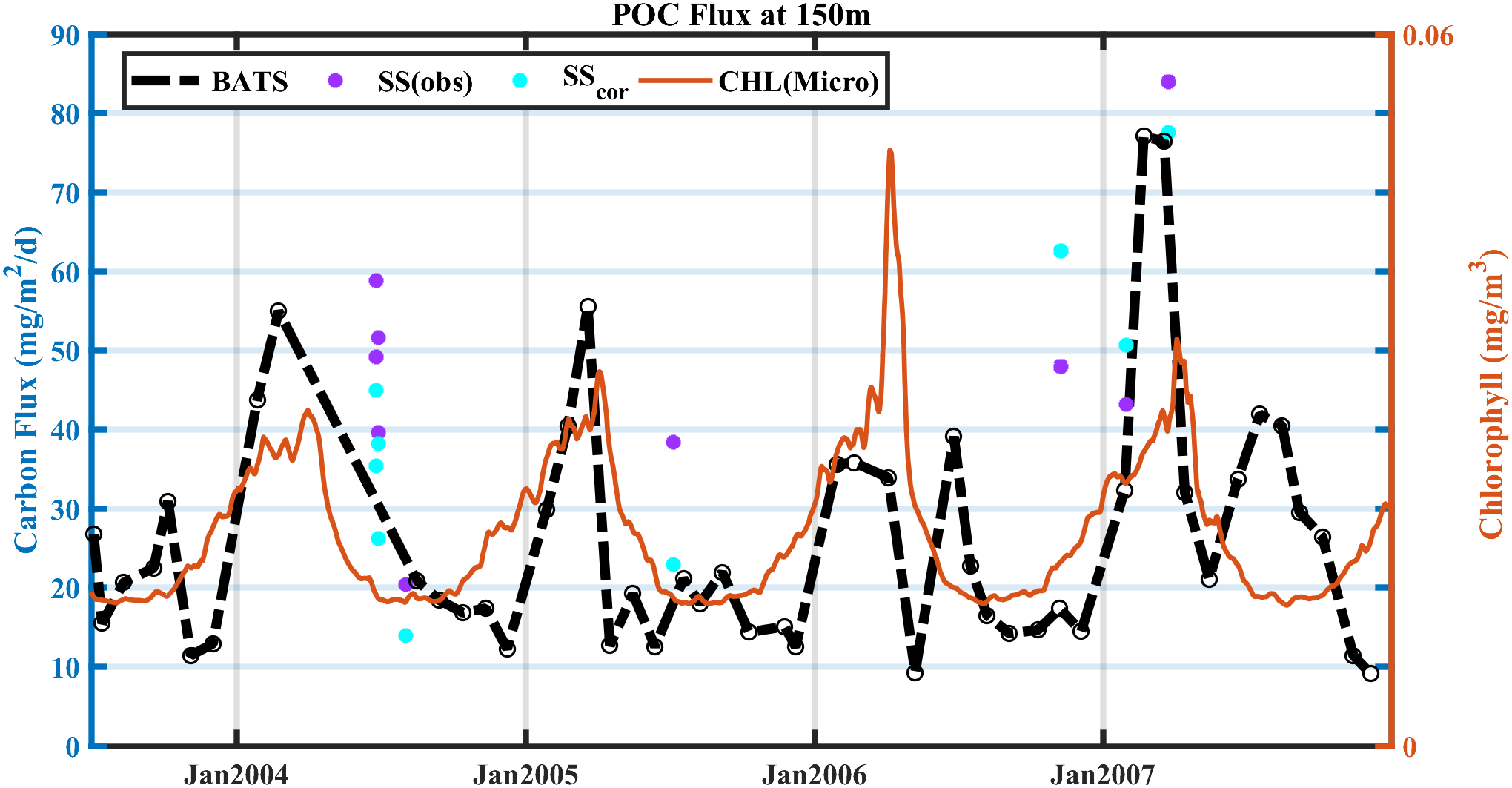 POC export flux derived from (purple) SS and (cyan) SScor for data sampled using the 234Th technique at BATS during 2003–2007. Black and orange lines are POC flux from sediment traps collected at BATS and satellite-derived chlorophyll concentration of micro-sized phytoplankton during September 2003–December 2007, respectively.