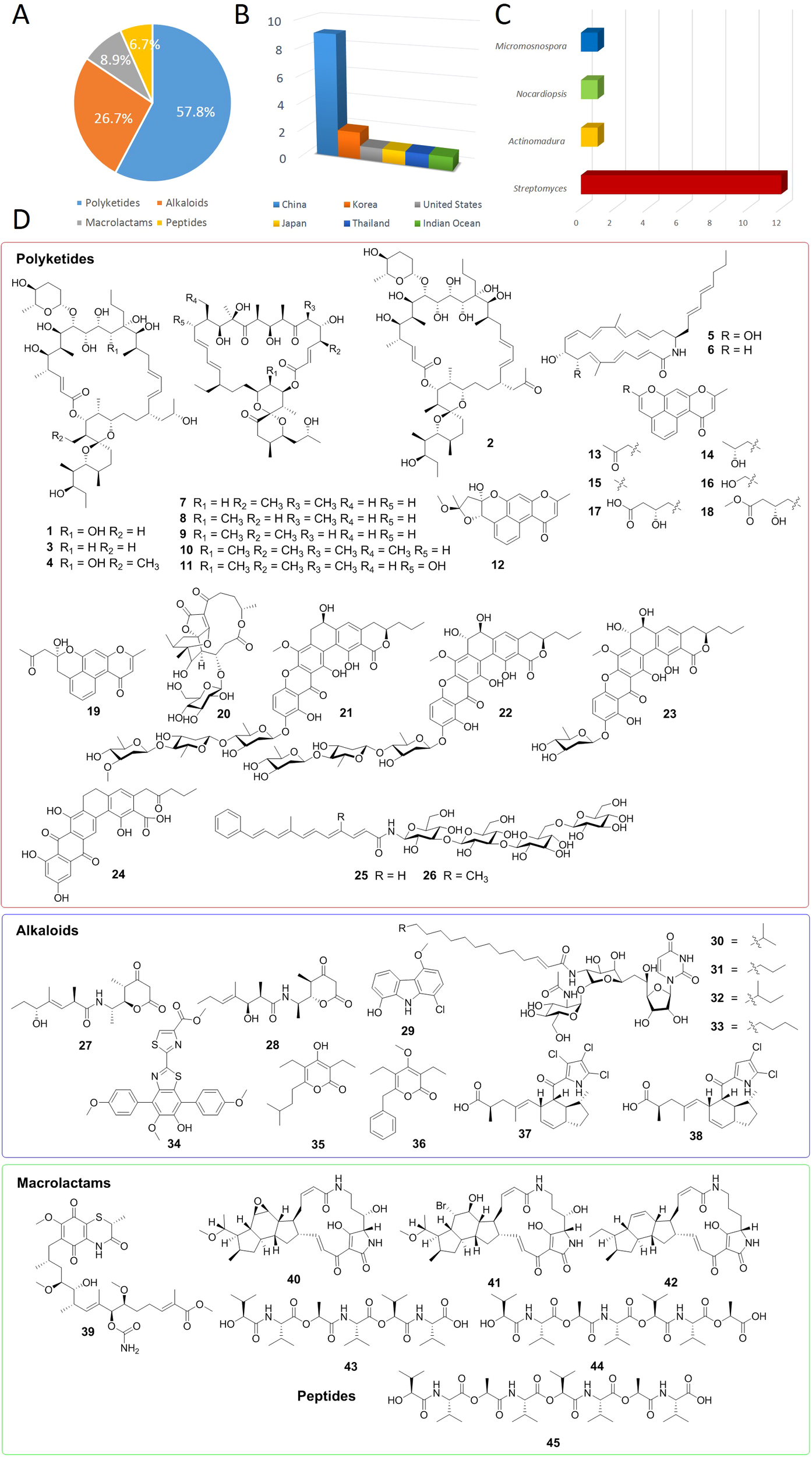 (A) Antibacterial compounds derived from marine actinomycetes according to structure types. (B) The different sources of marine actinomycetes. (C) The different genus of marine actinomycetes. (D) Chemical structures of compounds 1-45.