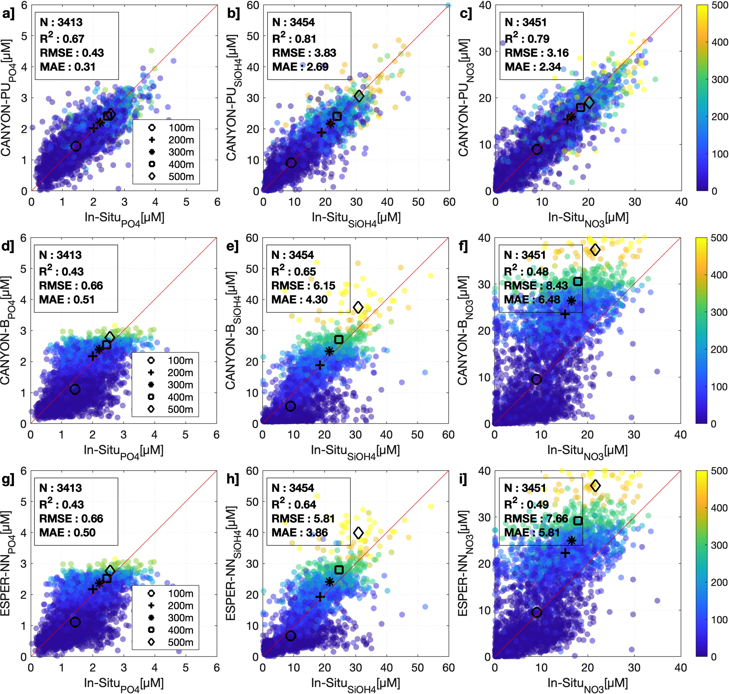 Scatterplot of validation dataset (20%) between in situ values against estimated of (a), (b) and (c) from (a-c) CANYON-PU, (d-f) CANYON-B and (g-i) ESPER-NN. The color represents the depth for each compared sample. The black markers show the averaged nutrient in a layer of 0–100 m, 100–200 m, 200–300 m, 300–400 m and 400–500 m. The slope chosen as the reference line is 1 (red).