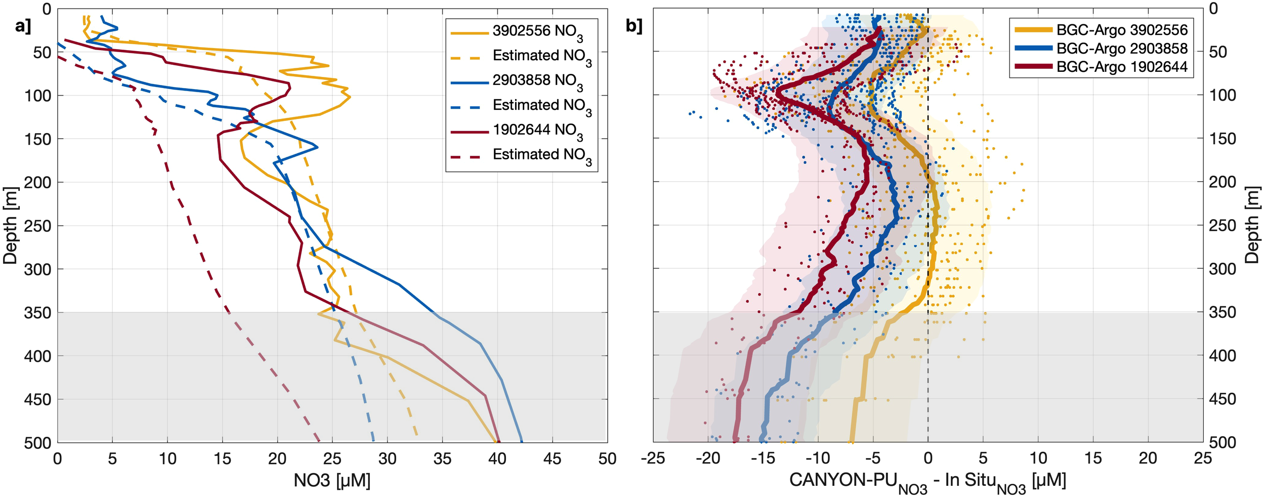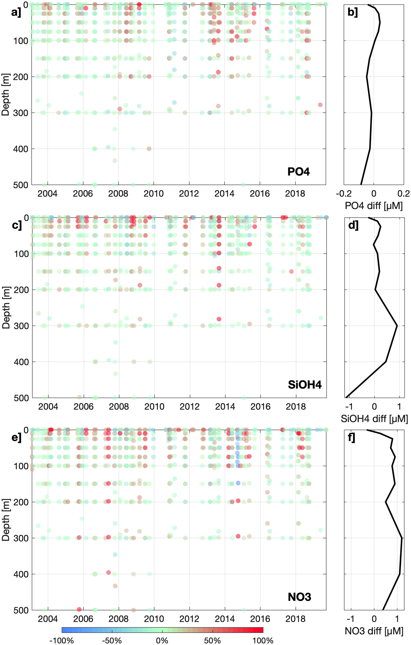 The relative and absolute differences between CANYON-PU and validation in situ dataset are shown on Figure 3 along vertical profiles. The relative variation is represented in percentage so that positive (negative) values represent an overestimation (underestimation) of the ANN. For all three nutrients it is noticeable that in the upper layers, above 50 m, concentrations are overestimated which likely reflects the highly variable nature of the system (Lüdke et al., 2019) and CANYON-PU cannot account for factors such as nutrient depletion, for example. The vertical differences (Figure 3) averaged by depth shows slight variations in accordingly with the high R2, whereas for and are noticeably underestimated by CANYON-PU below 200 m and 100 m respectively. Although the differences increased with depth, the relative differences showed values in the range +/- 10% confirming the robustness of CANYON-PU. That being said, we observed some relative positive outliers probably appeared due to sample contamination which causes nutrient consumption especially at higher concentrations (Dore et al., 1996).