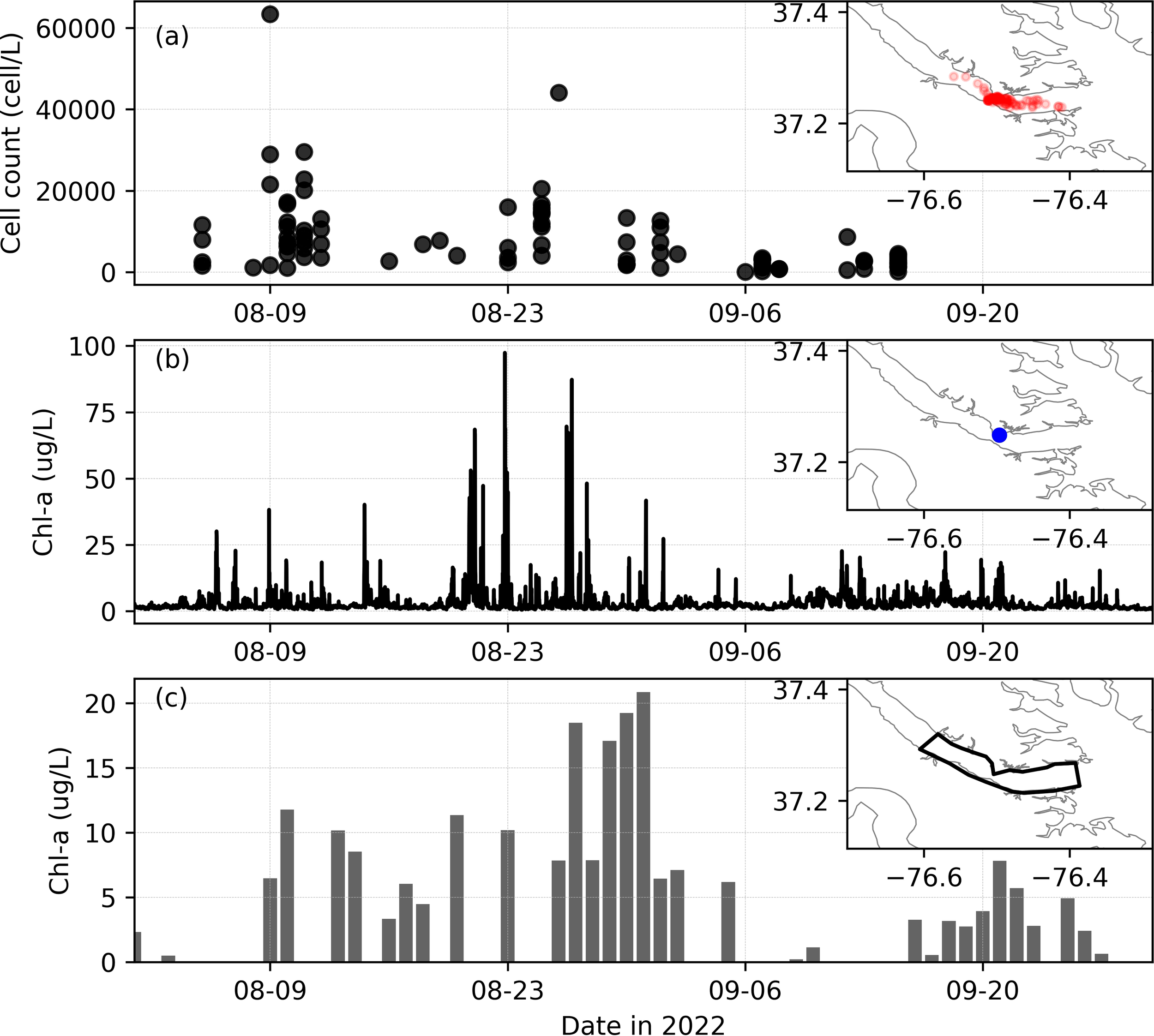 (a) Measured M. polykrikoides concentrations in the lower York River, with sampling locations shown in red circles in the map subset. (b) Measured Chl-a from a fluorometric sensor at VECOS station YRK005.40 (location marked in the subset). (c) Time series of Chl-a concentration averaged over a region of interest (marked with thick black polygon in the subset) from satellite imagery (OLCI, RE10). X and Y axes in the subsets represent longitude (deg) and latitude (deg), respectively.