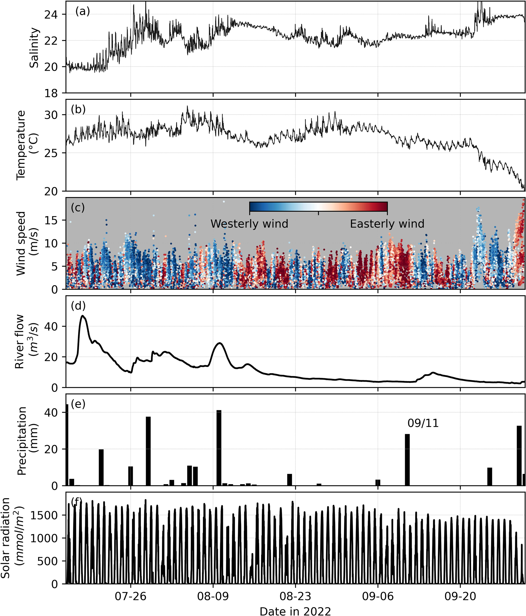 Physical conditions in the summer of 2022, including: (a) salinity and (b) temperature at VECOS station YRK005.40. (c) Wind speed measured at NOAA gauging station 8637689, with red dots indicating easterly wind, blue dots indicating westerly wind, and white dots indicating wind from the north or south. (d) River flow from the Mattaponi and Pamunkey Rivers. (e) Daily precipitation and (f) total photosynthetically active radiation (PAR) measured at station CBVTCMET maintained by the Chesapeake Bay-Virginia National Estuarine Research Reserve (data from https://cdmo.baruch.sc.edu/dges/).