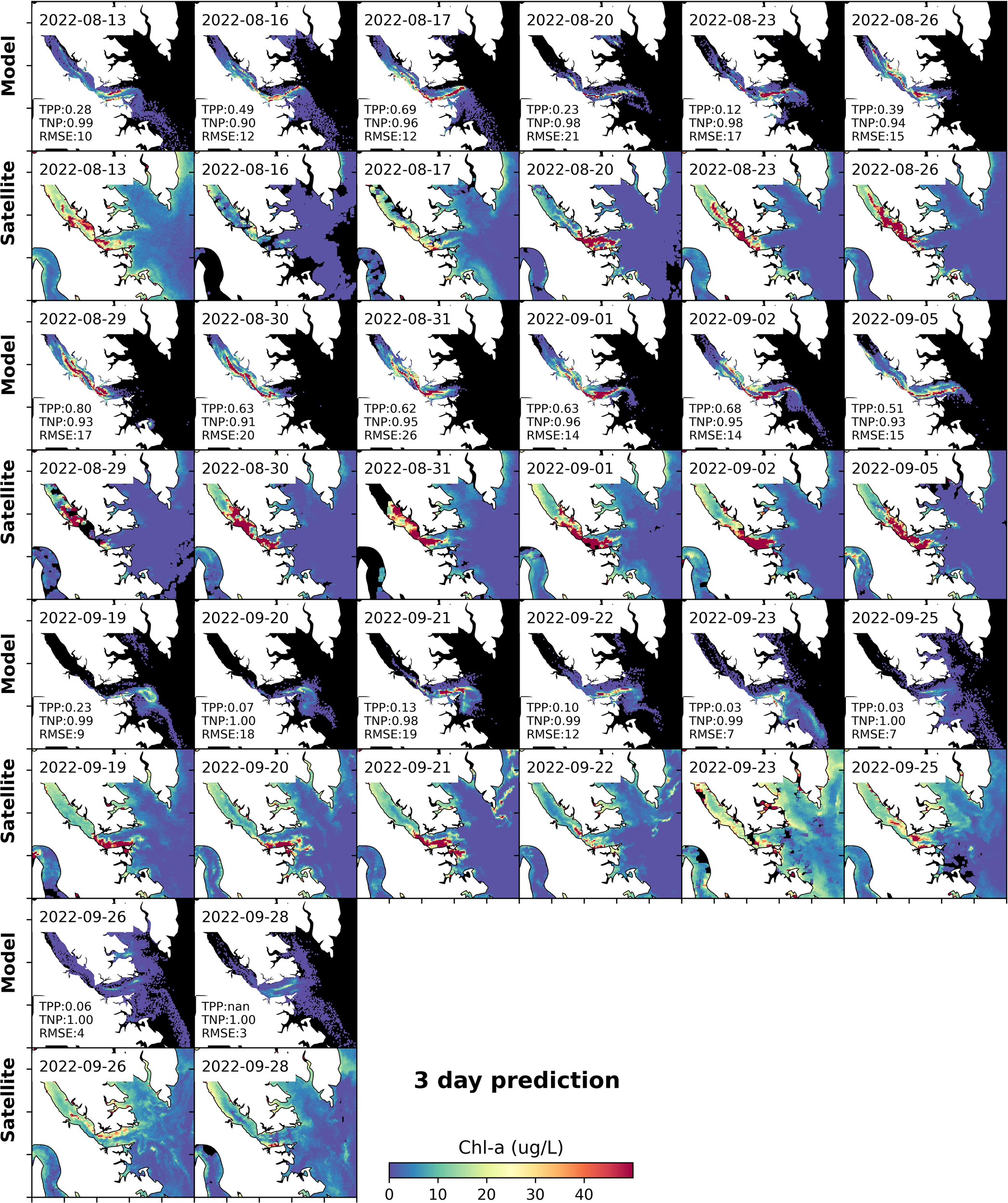 The high model performance is consistent for almost all release experiments. Due to cloud cover, not every release experiment has corresponding satellite imagery to compare and validate the model for a specific number of days after particle release. Taking a 3-day prediction as an example, there were 20 model runs which had corresponding satellite imagery that could be used for model-observation comparisons (Figure 8). Overall, the model generally captured HAB spatial distribution well, with median TPP and TNP values of 0.50 and 0.96 for the 3-day prediction, respectively, and a median RMSE of 23 ug L-1. Note that the large RMSE is partially due to the large magnitude of chlorophyll concentration during the bloom period. Comparisons for days 1, 2, 4, and 5 can be found in the supplemental materials (Supplementary Figures S3-S6).
