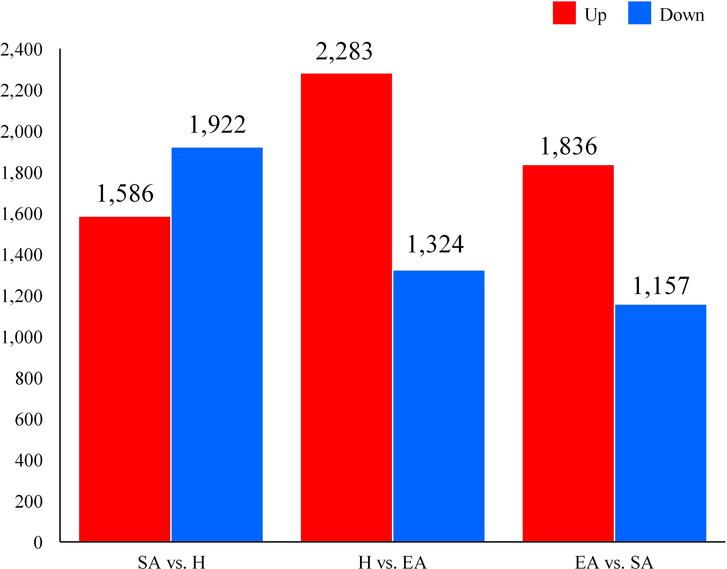 Among the three groups, the comparisons of DEGs yielded the following results: SA vs. H: 3508 DEGs (1586 up-regulated, 1922 down-regulated). H vs. EA: 3607 DEGs (2283 up-regulated, 1324 down-regulated). EA vs. SA: 2993 DEGs (1836 up-regulated, 1157 down-regulated). Notably, the shift from H to EA was primarily marked by the up-regulation in gene expression during the EA period. A total of 5705 upregulated DEGs were found between SA, H, and EA, and 4119 were up-regulated in the EA stage compared to SA, indicating an overexpression of genes associated with arousal (Figure 1).