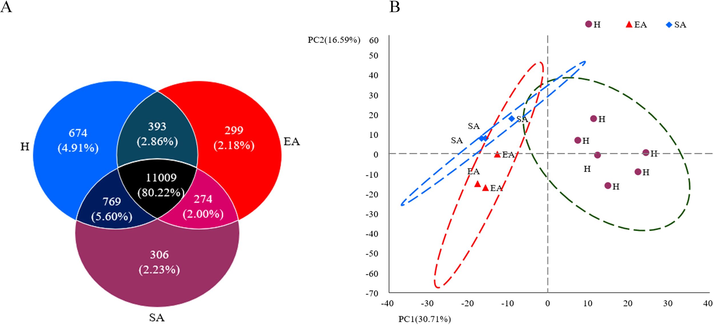 A sum of 13724 genes were obtained from the SA, H, and EA groups, of which 11009 (80.22%) DEGs were shared in all three groups, while 1279 genes were uniquely expressed in the H, SA, and EA groups, and 393 DEGs were shared between H vs. EA, 274 between SA vs. EA, and 769 between H vs. SA (Figure 2A). A principal component analysis (PCA) was used to characterize the compositional relationships among samples, and the results showed that SA, H, and EA were found to overlap with each other, demonstrating a good overall similarity of the biological repeats of the samples. The sum of the variability explained by the first two principal components PCs, PC1 (30.71%) and PC2 (16.59%), reached 47.30%. There were two main factors responsible for influencing P. sinensis liver changes during hibernation. Among them, the SA and EA phases overlapped, which might imply that the P. sinensis turtle shared some similar biological processes in these two phases. Additionally, the points of H and SA were adjacent, and the axis of PC1 mainly separated these two groups (Figure 2B).