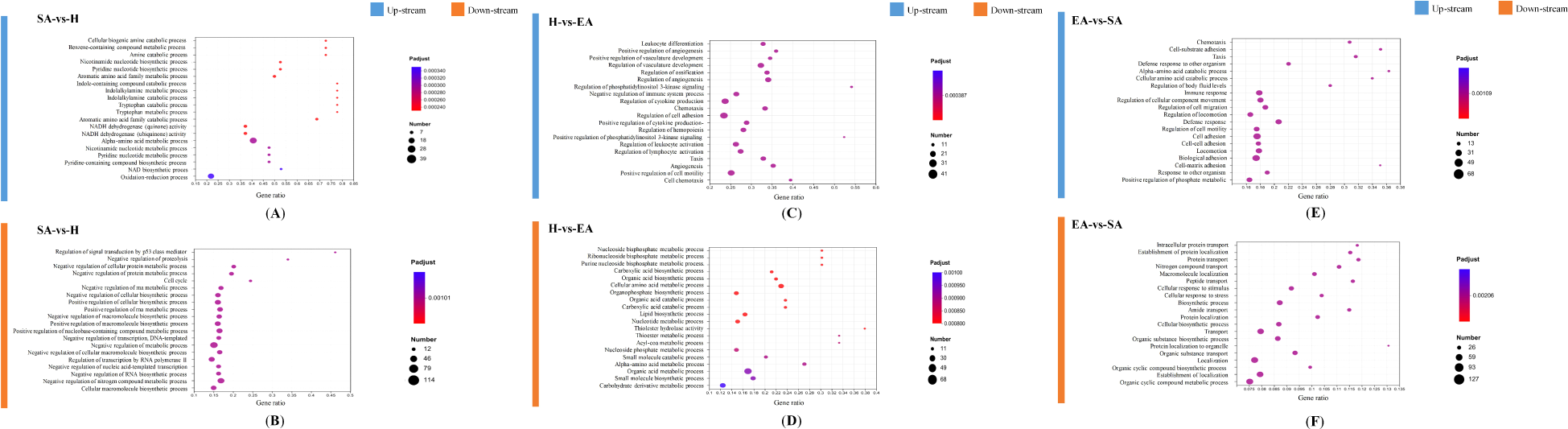 A GO functional enrichment analysis along with pathway annotation was conducted to comprehend the functions of the differentially expressed genes. We identified 146 statistically significant GO terms, including 1586 up-regulated and 1922 down-regulated DEGs in SA vs. H, 2283 up-regulated and 1324 down-regulated DEGs in H vs. EA, and 1836 up-regulated and 1157 down-regulated) DEGs in EA vs. SA group. Results were categorized into three categories: biological process, molecular function, and cellular component.