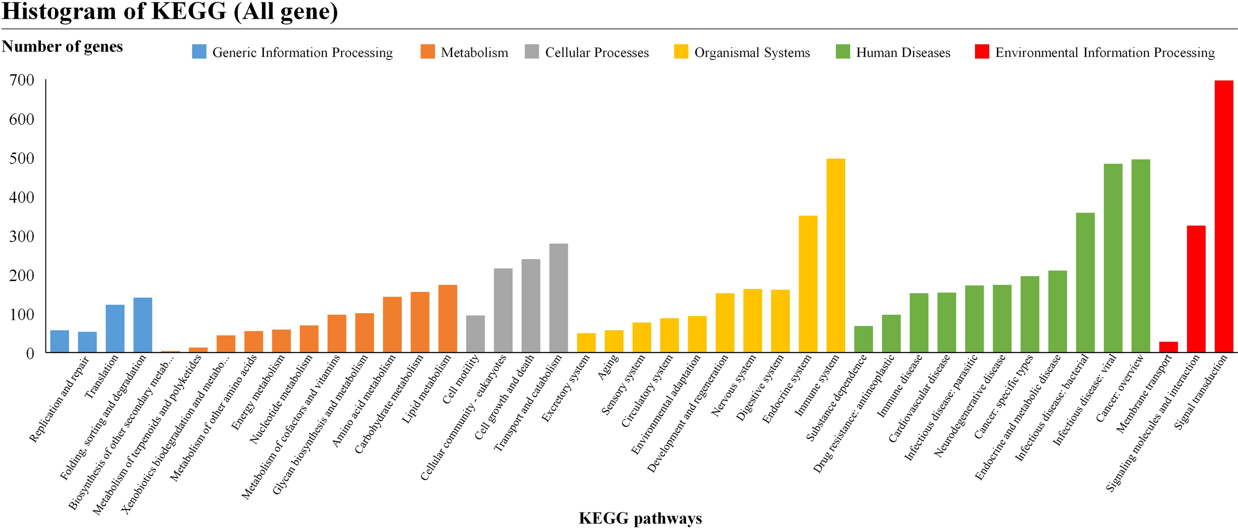 KEGG pathway enrichment analysis of differentially expressed genes. Pathways belonging to different classifications, including “Cellular Processes”, “Environmental Information Processing”, “Genetic Information Processing”, “Human Diseases” and “Metabolism”, were listed on the right of the plot.