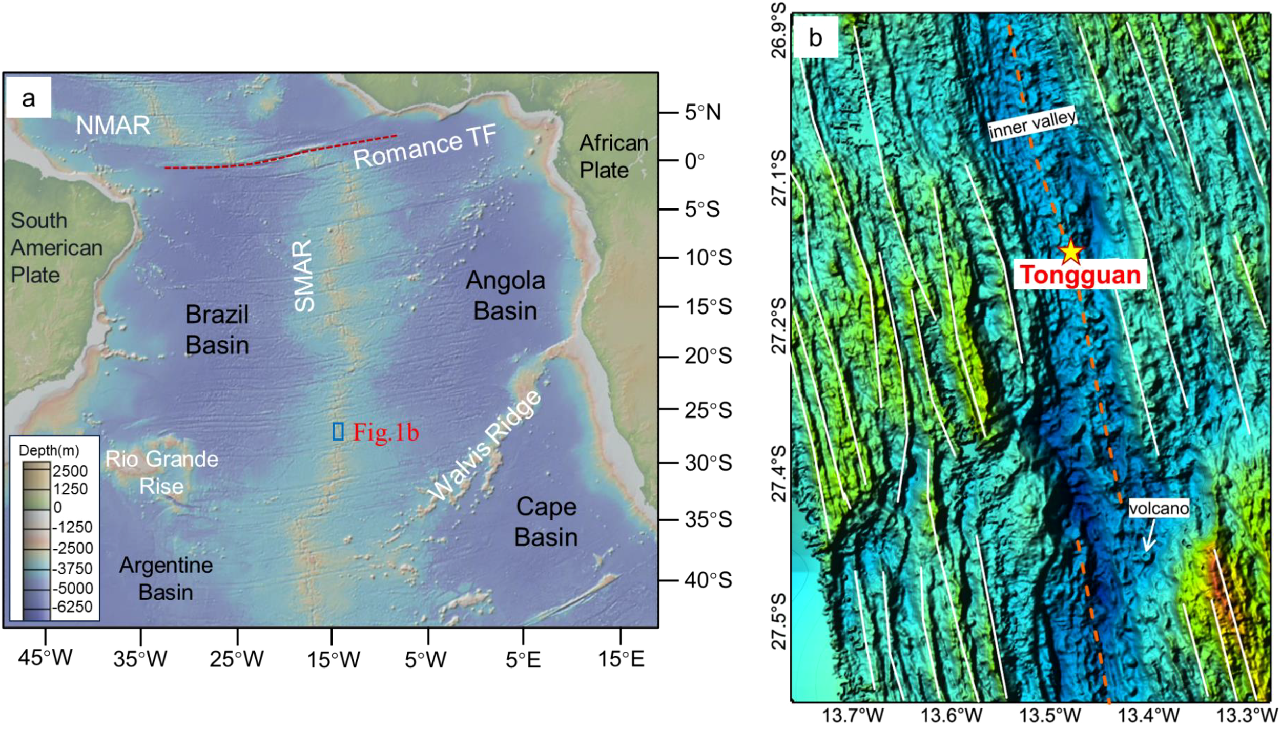 Tectonic boundaries and location of (b) along the southern Mid-Atlantic Ridge. (b) The topographic map of the ridge segment where the Tongguan (a) hydrothermal field is located, as measured by the shipborne multibeam survey.