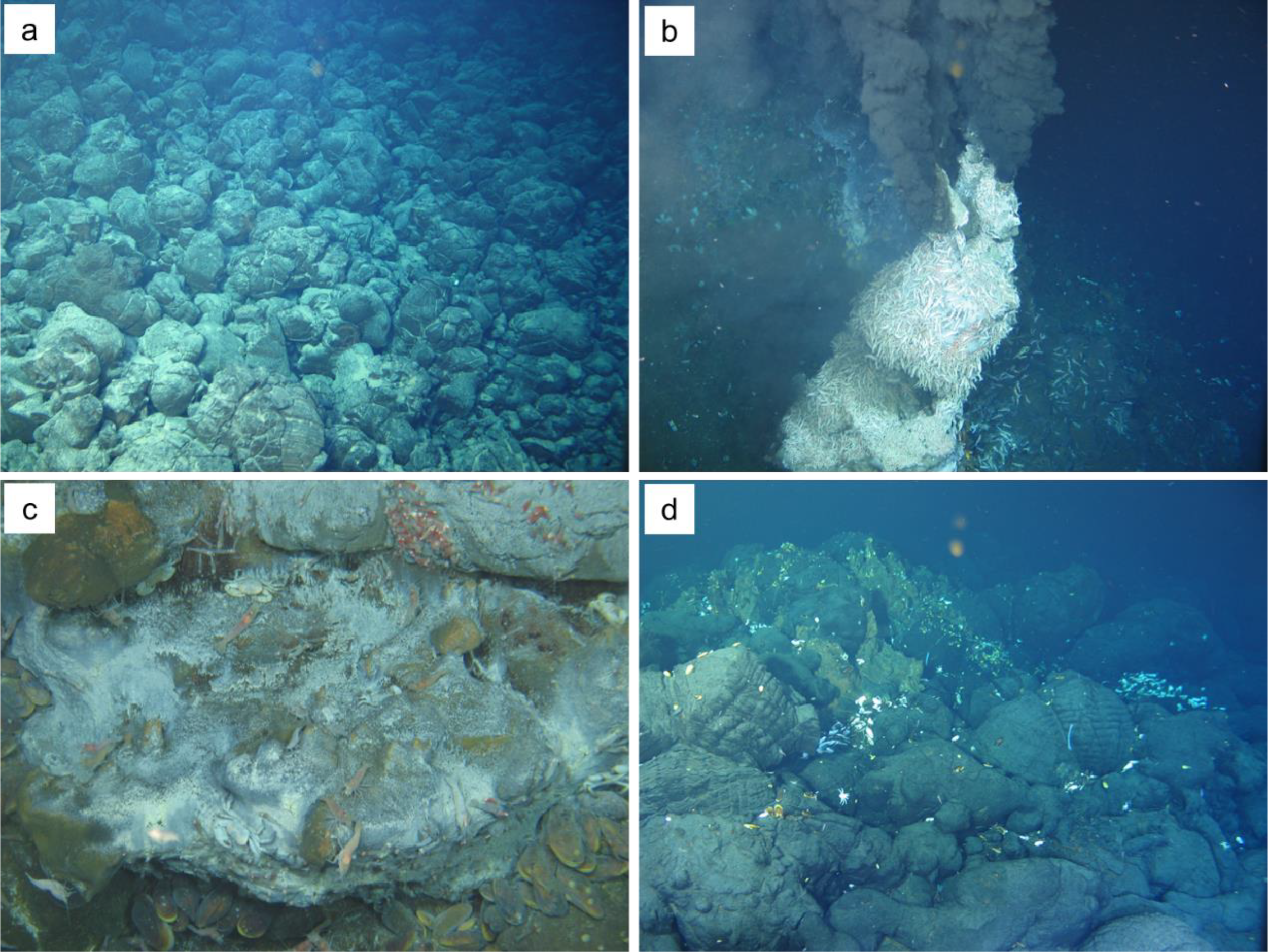 Photographs of the Tongguan hydrothermal vent field. (a) A large amount of fresh pillow basalt near the vent field. (b) An active hydrothermal vent edifice covered with countless hydrothermal blind shrimp. (c) White bacterial mats on the surface of sulfide edifices, along with microorganism such as blind shrimp, hydrothermal crabs, and mussels. (d) Small-scale inactive chimney structures and hydrothermal biological remains on the pillow basalt.