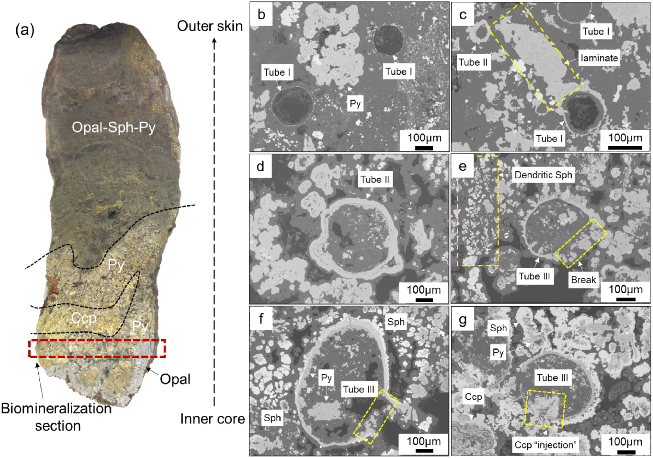 Based on the mineral filling and wall rupture of the tubes, tube structures can be categorized into three types. Tube I is characterized by a thin-walled tube composed of iron sulfides, which is hollow inside or filled with opal but not with sulfides (Figures 3b, c). Some Tube I structures have locally thickened walls due to the attachment of outward-growing pyrite laminates (Figure 3c). Tube II is an extension of Tube I where the wall is further thickened by the attachment of sulfide minerals and partially filled with a small number of sulfide aggregates (Figure 3d). Tube III, building on Tube II, shows further growth of the tube wall either inward or outward, with a noticeable presence of large sulfide aggregates inside (~100μm, Figures 3f, g). In some cases, it is clearly visible that chalcopyrite fills the tube from the outside in following wall rupture (Figure 3g).