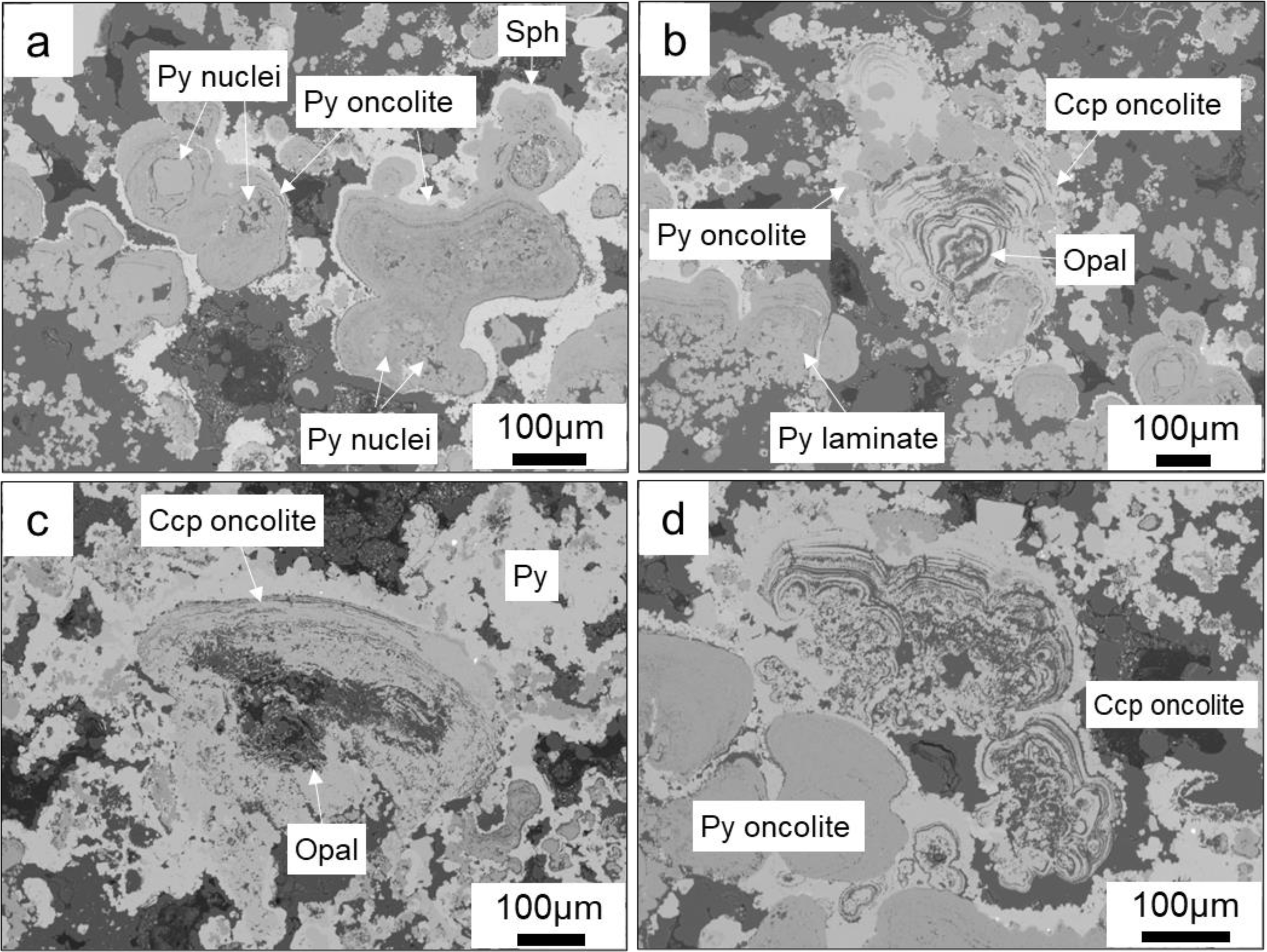 Backscatter electron microscopy of Quasi-oncolite structures within chimney wall. (a) Quasi-oncolite Structures with early pyrite crystals as the nuclei, generally formed by the fusion of multiple-nuclei closed pyrite laminates; (b–d). Quasi-oncolite structures with nuclei primarily composed of crystals containing amorphous silica. In (b), the chalcopyrite laminates encase a certain amount of small pyrite-dominated oncolites, while in (c, d), the closed laminates are more irregular in shape, and the oncolites are coated by later-stage pyrite.