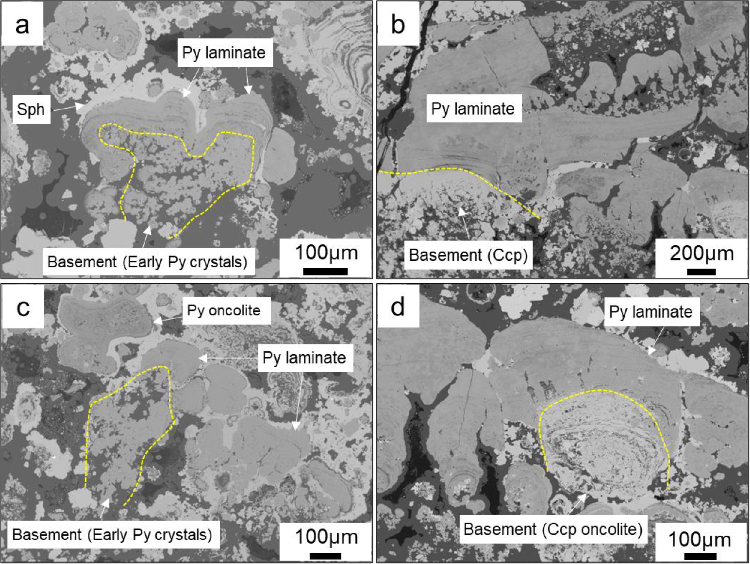 Backscatter electron microscopy of quasi-stromatolite structures within Chimney Wall. (a) Pyrite laminate growing on the basement of early subhedral pyrite aggregates, subsequently coated by colloform sphalerite; (b) Pyrite laminate stratifying growth on the basement of early anhedral chalcopyrite; (c) Pyrite laminate associated with pyrite oncolite; (d) Pyrite laminate growing on the basement of early chalcopyrite oncolite.