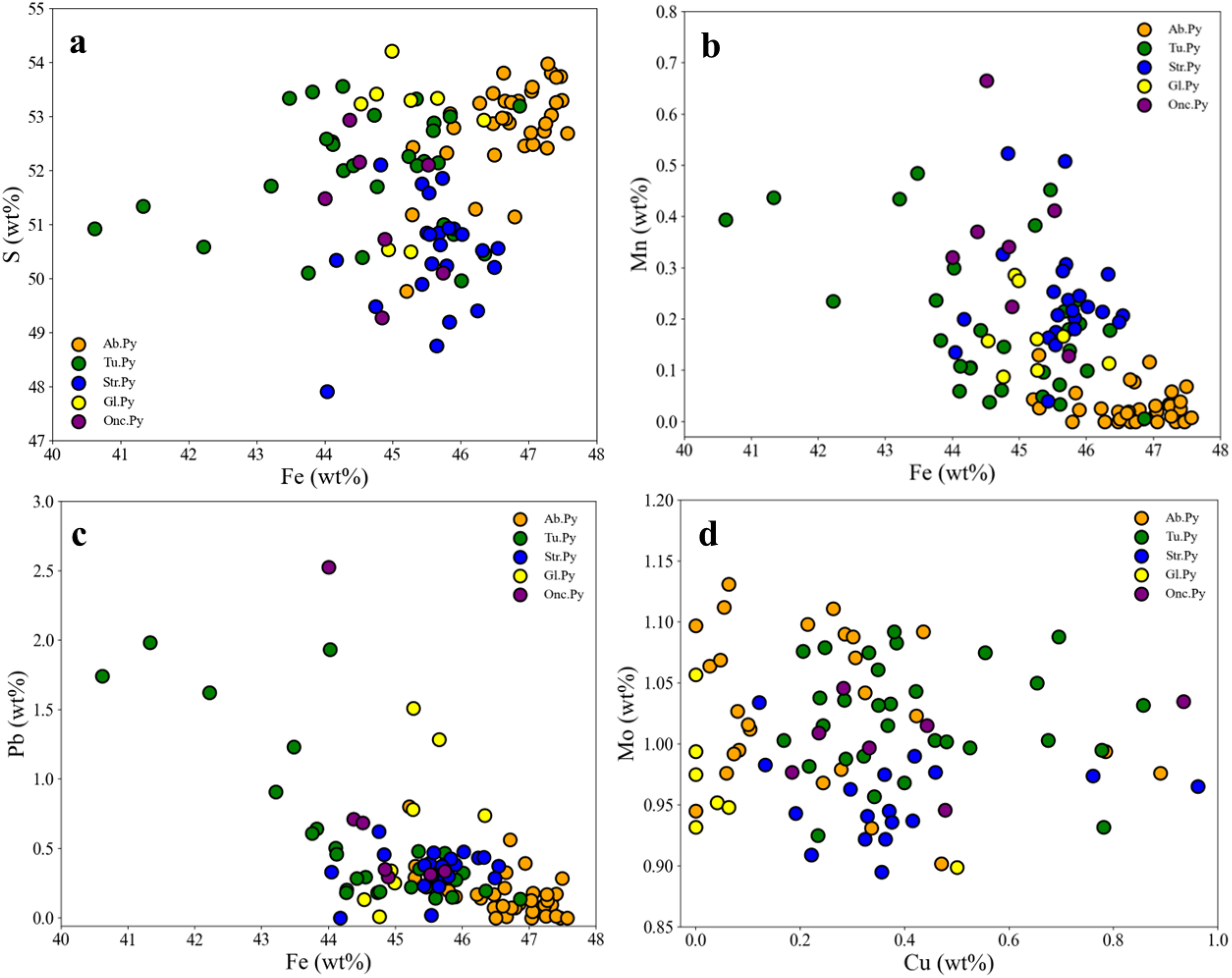 EPMA element correlations for (a) Fe-S, (b) Fe-Mn, (c) Fe-Pb, and (d) Cu-Mo in 5 types of pyrite, comprising 4 types of biogenic pyrite and 1 type of abiotic pyrite. The data for 2 inclusions within (Str. Py) are excluded from the d plot (see Supplementary Table 2). Tu. Py, pyrite on tube wall, Str. Py, Quasi-stromatolite Pyrite, Onc. Py, Quasi-oncolite Pyrite, Gl. Py, Globular Pyrite, Ab. Py, Abiotic pyrite.
