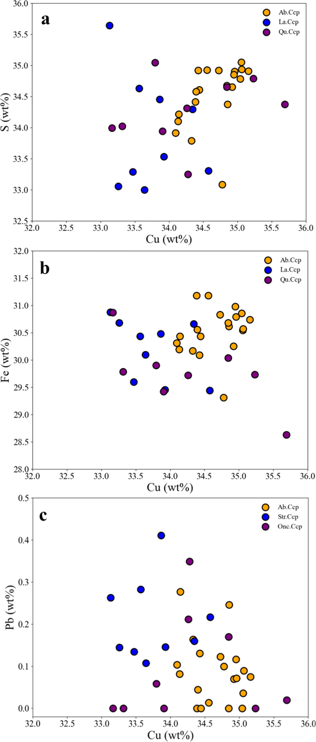 EPMA element correlations for Cu-S, Cu-Fe, Cu-Pb in 3 types of chalcopyrite, comprising 2 types of biogenic chalcopyrite and 1 type of abiotic chalcopyrite. In biogenic chalcopyrite, data for several inclusions containing sphalerite are excluded. Str. Ccp, Quasi-stromatolite Chalcopyrite, Onc. Ccp, Quasi-oncolite Chalcopyrite, Ab. Ccp, Abiotic Chalcopyrite.
