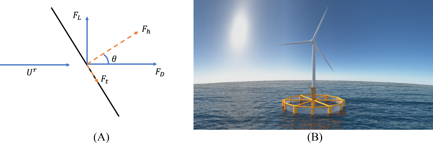 Drag () and lift () forces on a net panel. is the angle between the normal of the net panel and the direction of the instantaneous, relative flow velocity, , and denote the corresponding normal and tangential components of the hydrodynamic, viscous forces (A) and Schematic representation of innovative coupled system (B).