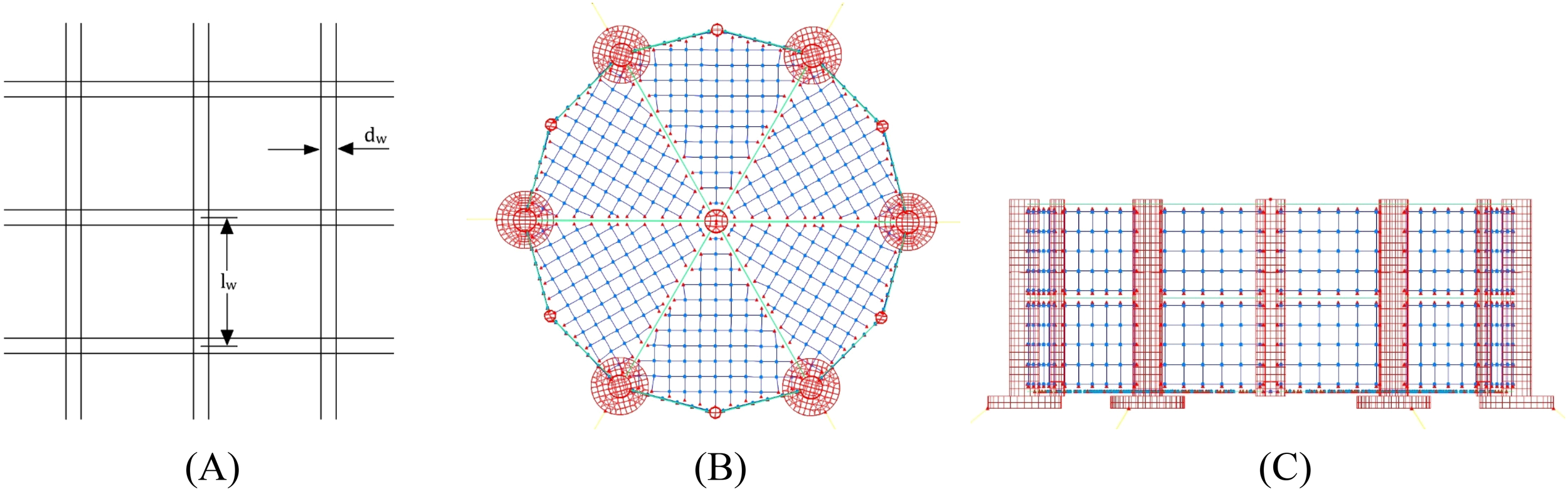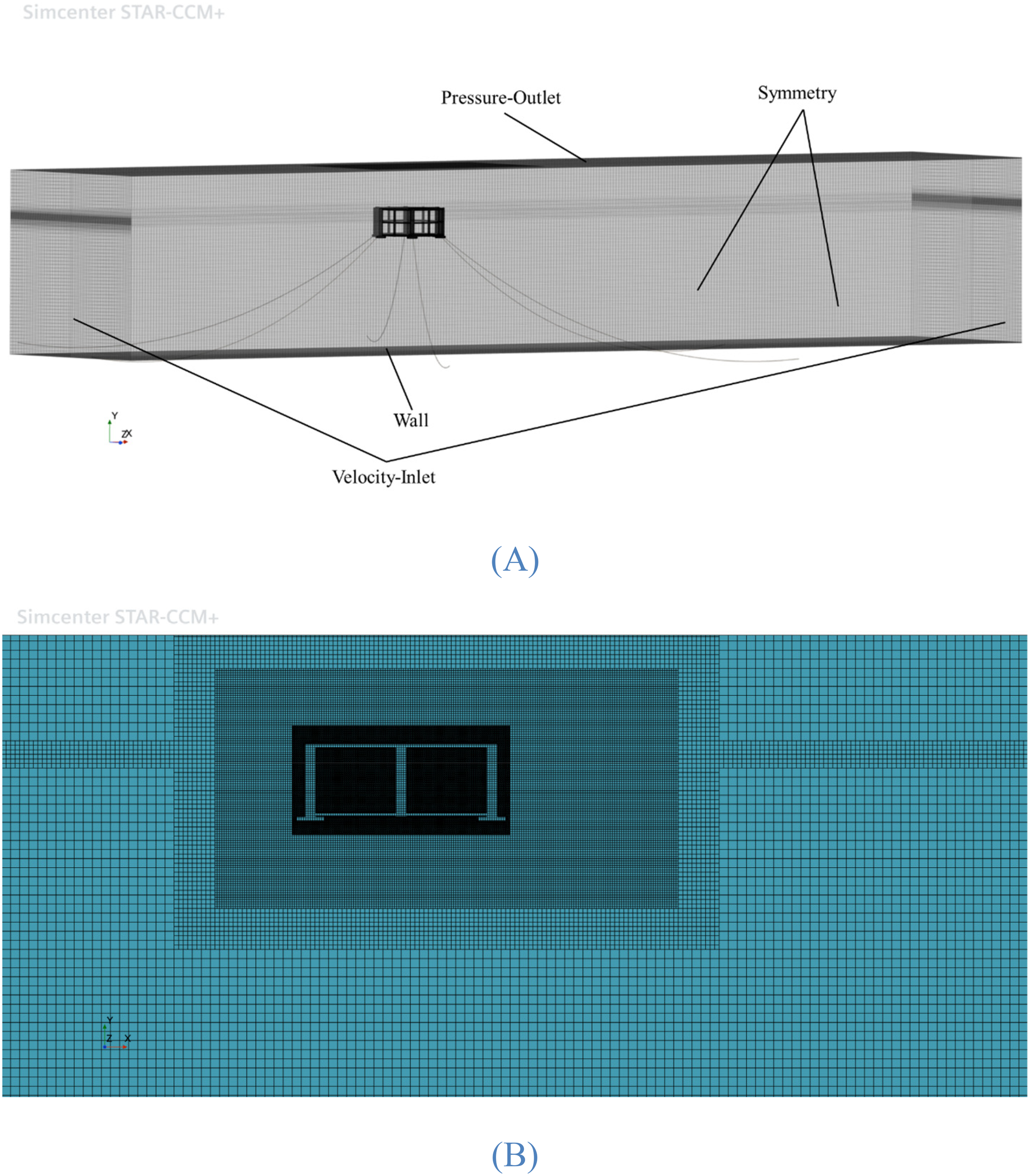 The net is arranged on the sides and bottom of the cage. The cage sides have a total of 12 net panels, each consisting of 30 nodes and 71 ropes, fixed onto a rectangular frame composed of short trusses, horizontal braces, large columns, and small columns. The bottom of the cage has six net panels, each consisting of 61 nodes and 134 ropes, fixed onto a harp-shaped frame made up of two adjacent long trusses and two adjacent short trusses. For specific model net arrangement, see Figures 3B and C.