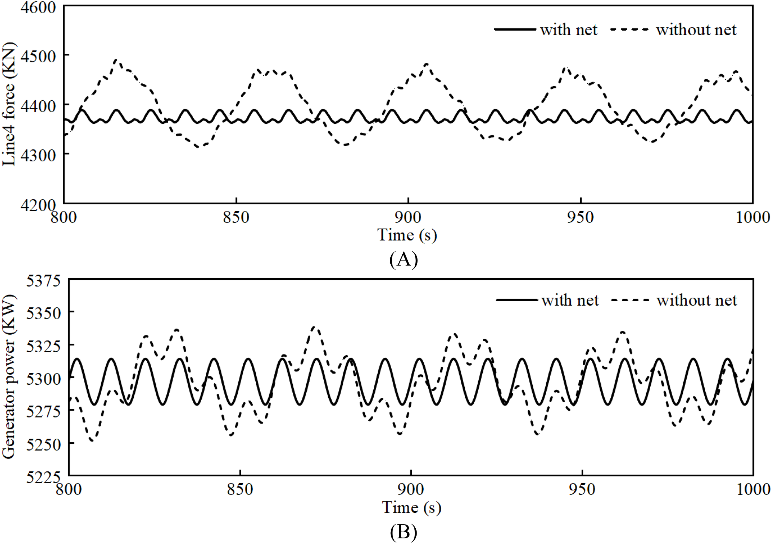 In this study, the lumped mass approach was employed to model the aquaculture netting, aiming to simplify the complex structure of the net and enhance computational efficiency. However, this method, despite its widespread application in engineering, is not without limitations. For instance, the lumped mass approach neglects the local deformations within the net and the nonlinear effects that arise from the interaction between the net and the fluid. This simplification may lead to an underestimation of the actual damping effect of the net, thereby affecting the accuracy of the platform’s dynamic response predictions. Moreover, the geometric parameters of the net (e.g., solidity and mesh size) significantly influence its hydrodynamic characteristics. The selection of these parameters is subject to uncertainties, which may introduce additional inaccuracies into the modeling process. This paper designs the actual mesh size to be 2 cm in length and 1.67 mm in diameter of the netting twine, at which the solidity of the net is 1.6, consistent with the solidity of the net used in “Ocean Farm 1” (Jin et al., 2021). Based on the equivalent net solidity Equation 14, the width of the equivalent net model is determined to be 4 m, with a diameter of 0.335 m.