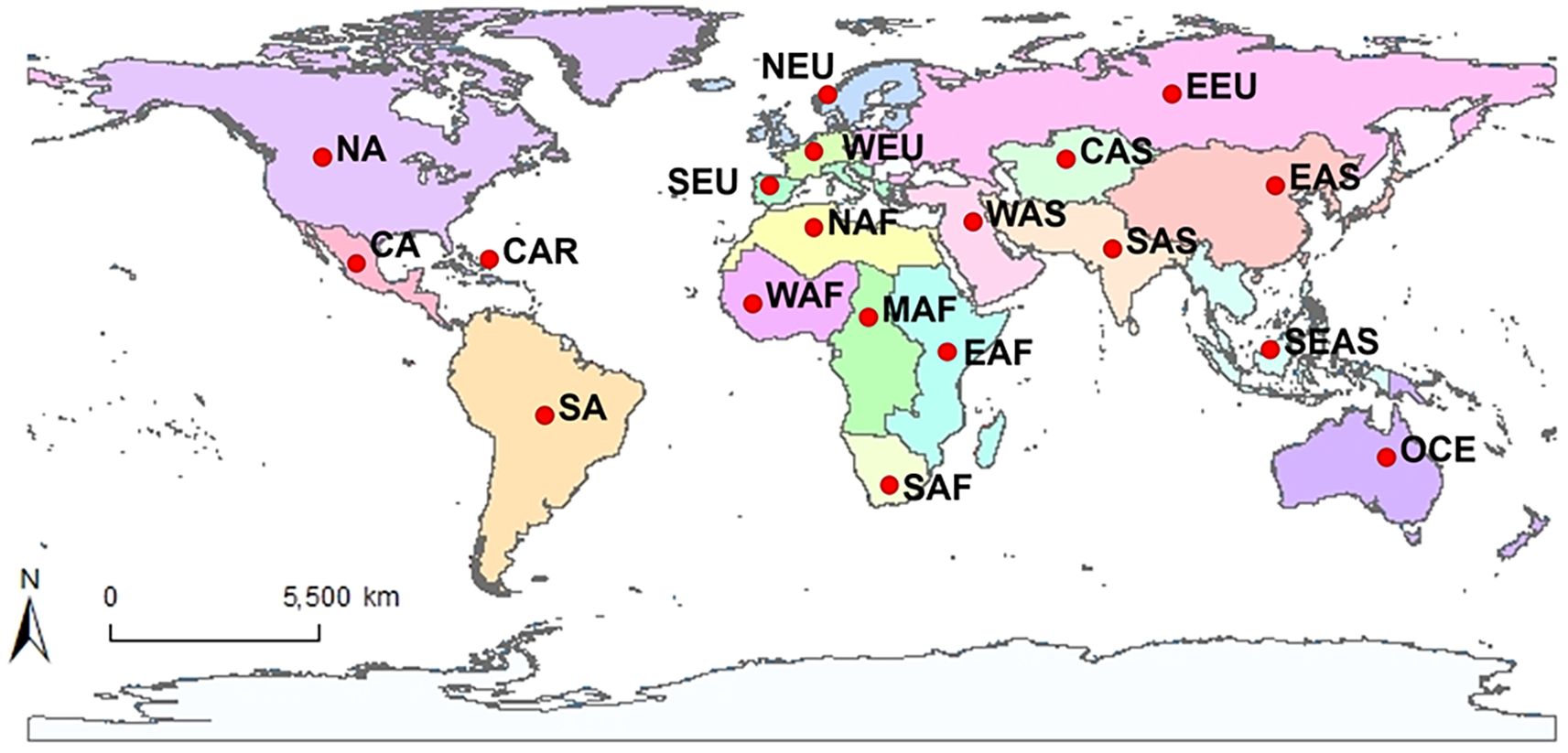 This study adopts the Food and Agriculture Organization (FAO)’s regional classification framework to define the spatial scope of analysis. A total of over 190 countries and regions were aggregated into 20 standardized FAO regions, of which 19 were used in this study after excluding one unidentifiable entity (Figure 1A). These regions provides a consistent spatial basis for analyzing seafood production, trade flows, and carbon emissions across different parts of the world. To support regional-level analysis, all countries were assigned to their corresponding FAO region according to the latest official mapping. This ensures that data aggregation and comparison are spatially consistent.