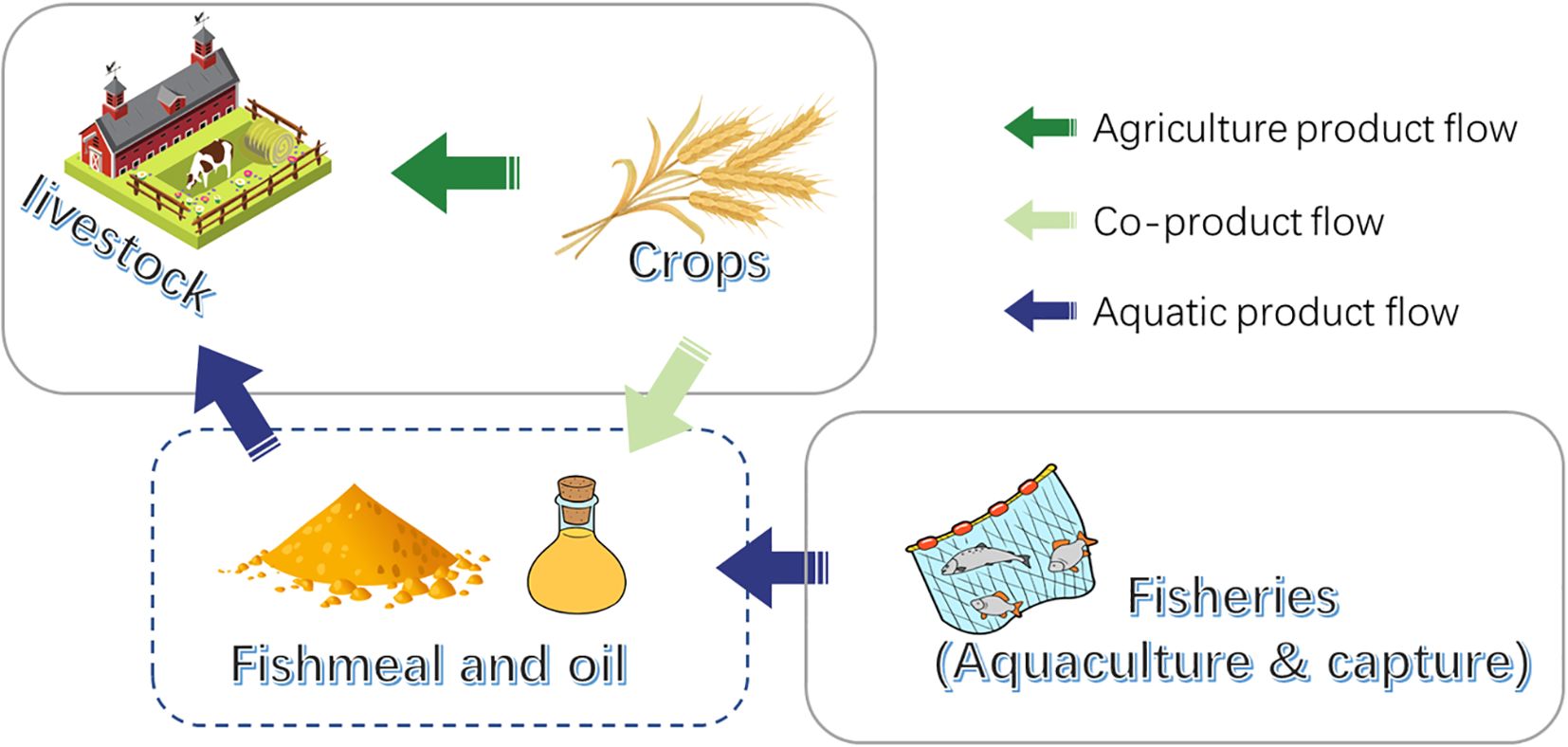 2. How can material flow relationships and potential carbon footprints between aquaculture and other agricultural sectors (e.g., fisheries, livestock, and arable land) be characterized through the lens of fishmeal and fish oil?