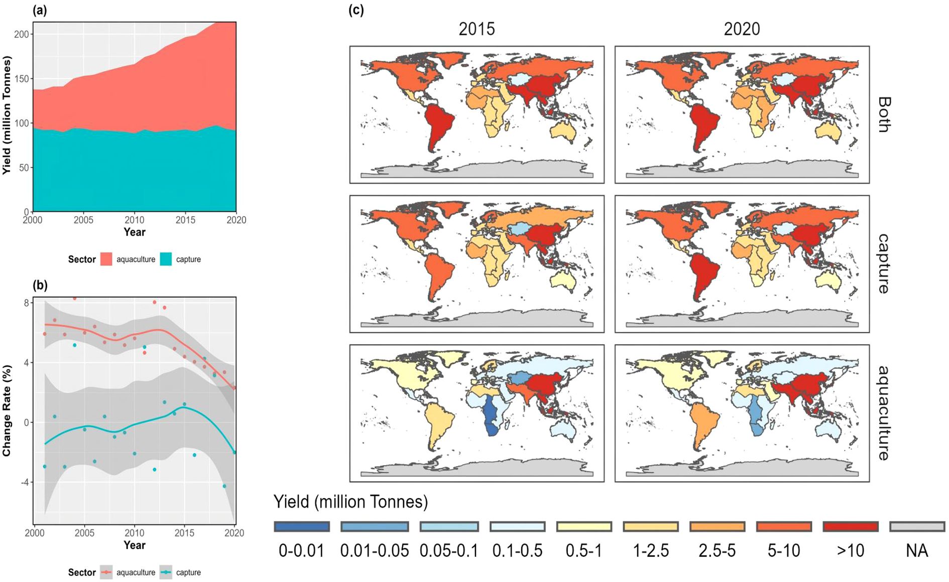 Figure 3. Spatiotemporal variation of aquatic product production at the regional scale in 2015 and 2020. (a) Global Capture and Aquaculture Production; (b) Growth Rates Capture and Aquaculture Production from 2000 to 2020 based on FAO; (c) Spatial distribution of aquatic product production.