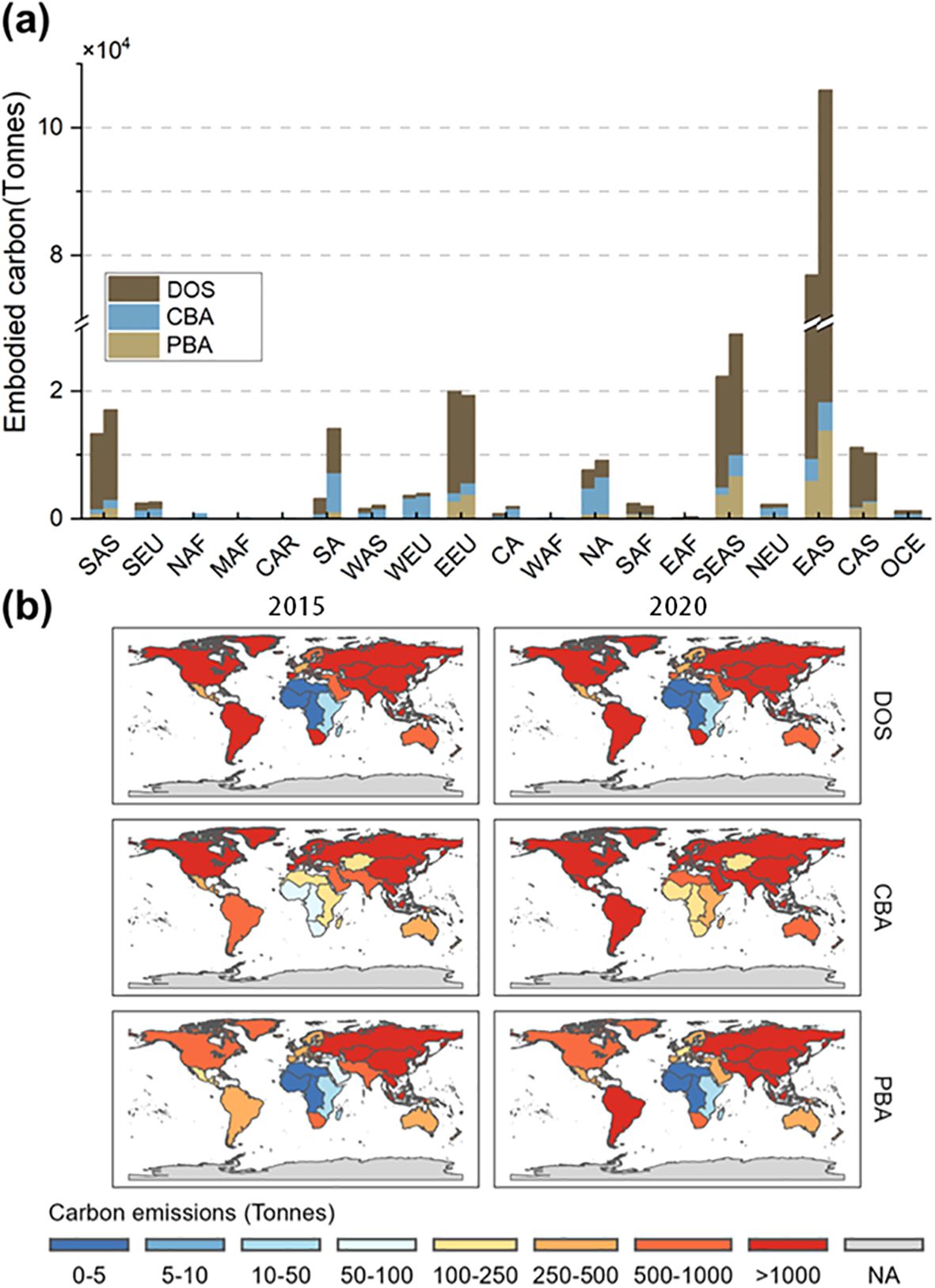 Further analysis of DOS and CBA emissions reveals that 16 of 19 regions experienced an overall increase from 153,151 tons to 191,404 tons. Despite these changes, the global spatial pattern remained largely stable. East Asia, Eastern Europe, South America, and North America consistently ranked among the highest emitters, while the fastest growth occurred in South Asia (353.29%), Central Asia (158.36%), East Africa (137.22%), and North Africa (545.61%). These growth trends highlight regional disparities in production expansion and trade integration.