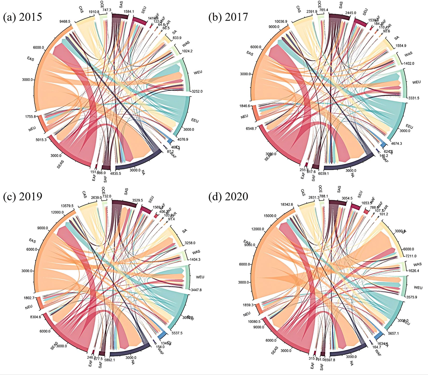 Figure 5. Implied cross-regional carbon footprint flow of PBA. (a–d) represent the flow directions and quantities of PBA for the four years from 2015 to 2020, respectively.