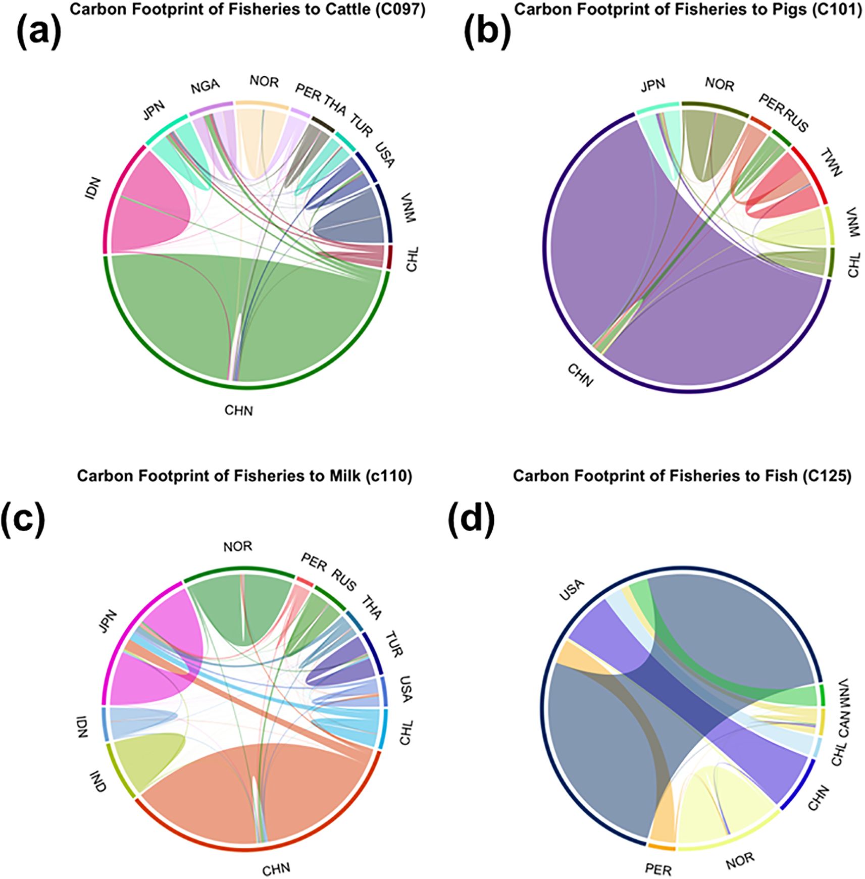 Sector-specific analysis, as shown in Figure 7, indicates that China leads in the use of fishmeal and fish oil across four major sectors. These sectors include cattle, pigs, milk, and fisheries. This finding highlights China’s central role in global fisheries resource consumption. In the cattle sector (Figure 7A), China dominates as the top receiver, followed by Japan, Norway, Peru, and Chile. In the pig sector (Figure 7B), China again leads, with a more geographically diverse distribution, including significant exports from Norway and Chile. The milk sector (Figure 7C) shows similar trends, with China as the top receiver, and Peru, Norway, and Japan supplying large volumes to support global dairy production. In the fisheries sector (Figure 7D), the United States holds the largest footprint, reflecting high internal consumption of fishmeal and fish oil in aquaculture. Overall, China stands out as the primary consumer, while Norway, Peru, Chile, and the U.S. act as major global suppliers. These trans-regional flow patterns show the centrality of fishmeal and fish oil in supporting diverse agri-food systems and their substantial environmental footprint across global supply chains. Sector-specific analysis of region in Supplementary Figure S2, S3 in the supplement.