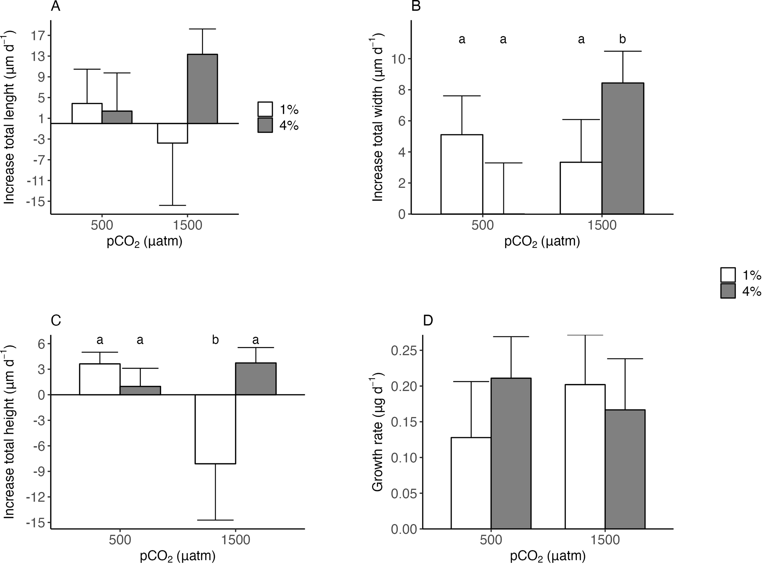 Tagelus dombeii: morphological changes with increase of total length (A), increase of total width (B), increase of total height (C), and growth rate (D) in each experimental condition. The treatments were conditions of pH (500 µatm and 1500 µatm) and food supply (1% and 4% dry weight). The letters in lowercase indicate and mark the significance.