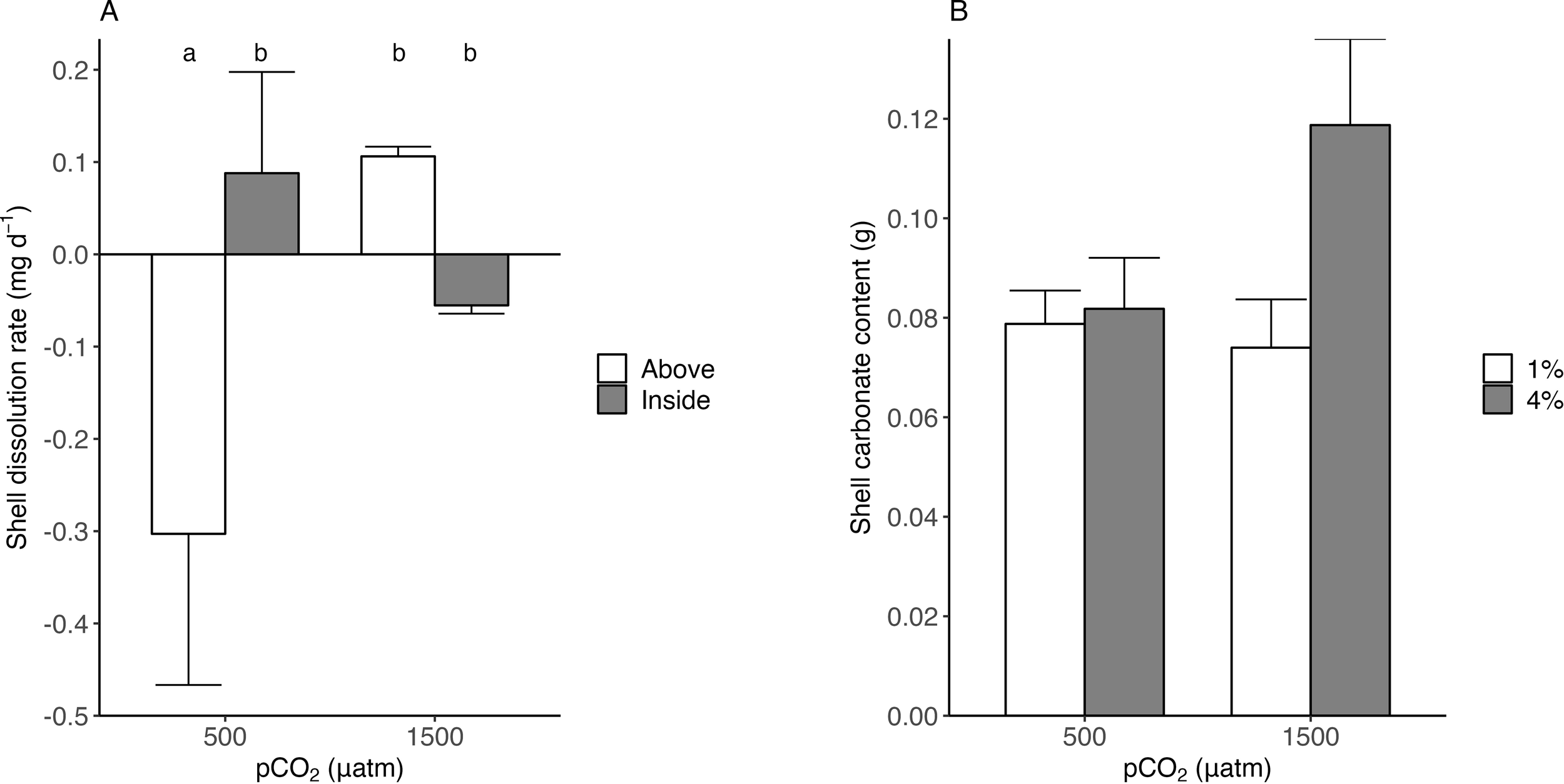 Shell dissolution rate (A), measured above and below the sediment, and shell carbonate content (B) in empty shells of Tagelus dombeii after 67 days of exposure to experimental conditions. The treatments in panel B correspond to pH levels (500 µatm and 1500 µatm) combined with food supply (1% and 4% dry weight). The letters in lowercase indicate and mark the significance.