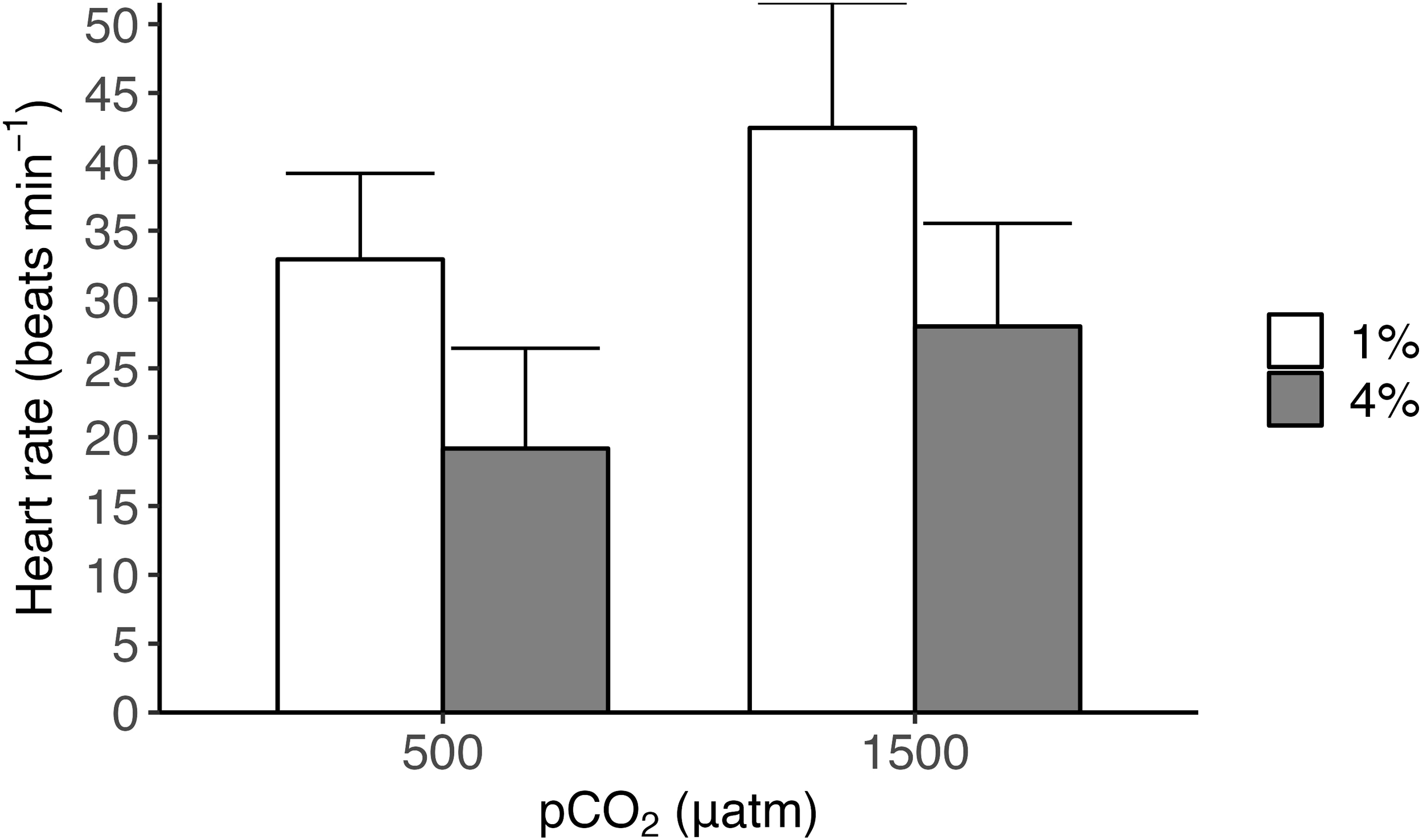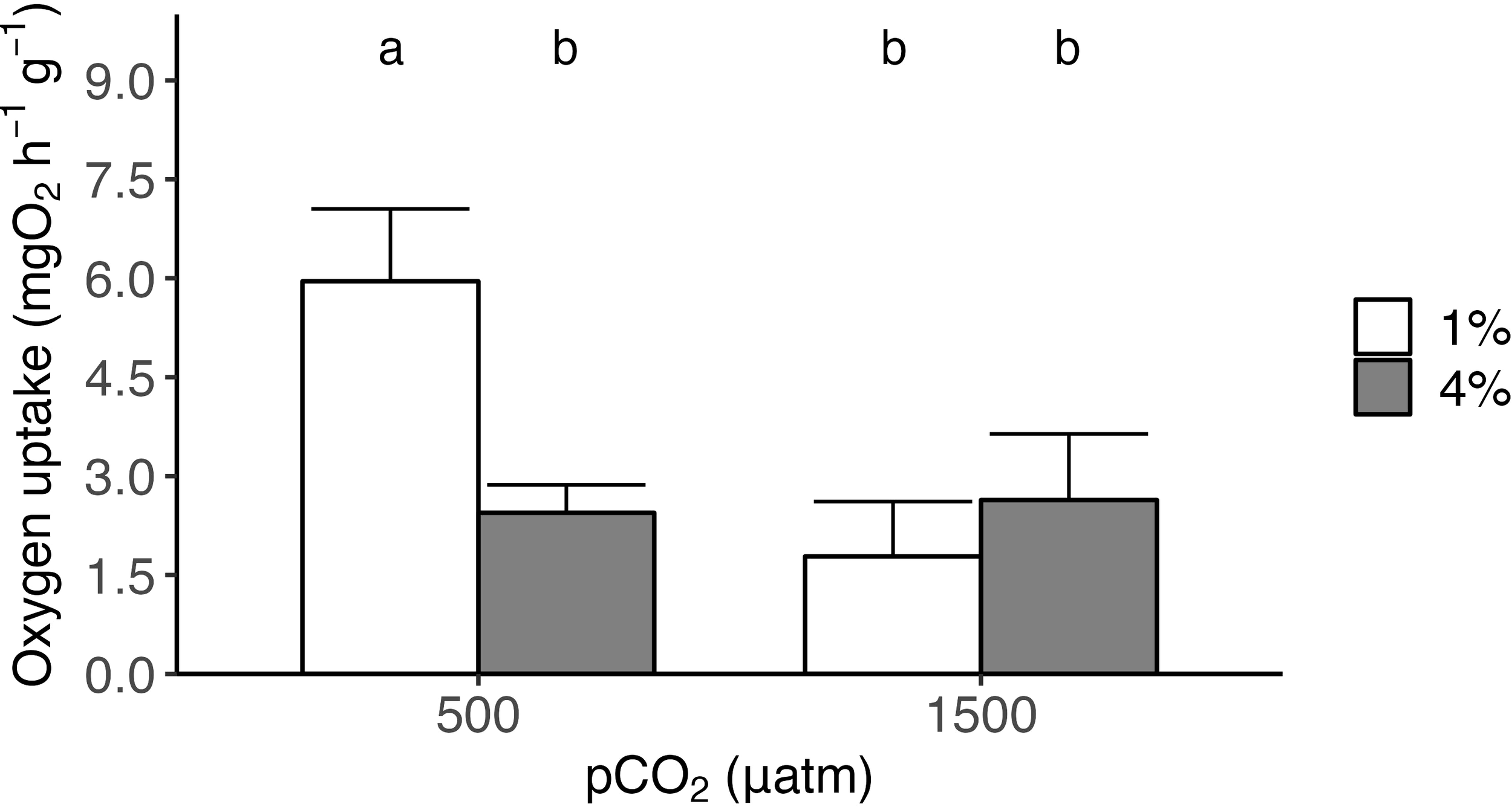 Mortality was assessed after the experimental trial. Under the 500 µatm CO2 treatment, individuals exposed to a 4% food supply exhibited a mortality rate of 38.5%, whereas those maintained at a lower food level (1%) showed reduced mortality (14.3%). In contrast, at 1500 µatm CO2, mortality remained at 25.0% under the 4% food condition but increased markedly to 54.0% under the 1% food supply, highlighting an interactive effect between food availability and CO2 levels on survival.