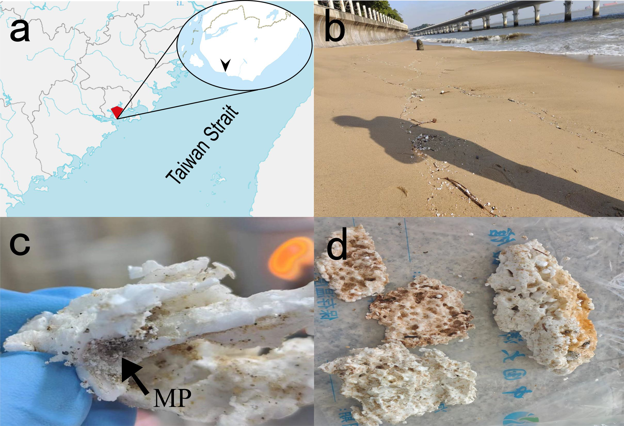 ESP debris in Bai-cheng beach of Xiamen Island and sampled items. (a), Map of sampling sites; (b), Xiamen Island coast; (c), MP, particles smaller than 5 mm indicated by arrows; (d), LP, plastics larger than 5 mm.