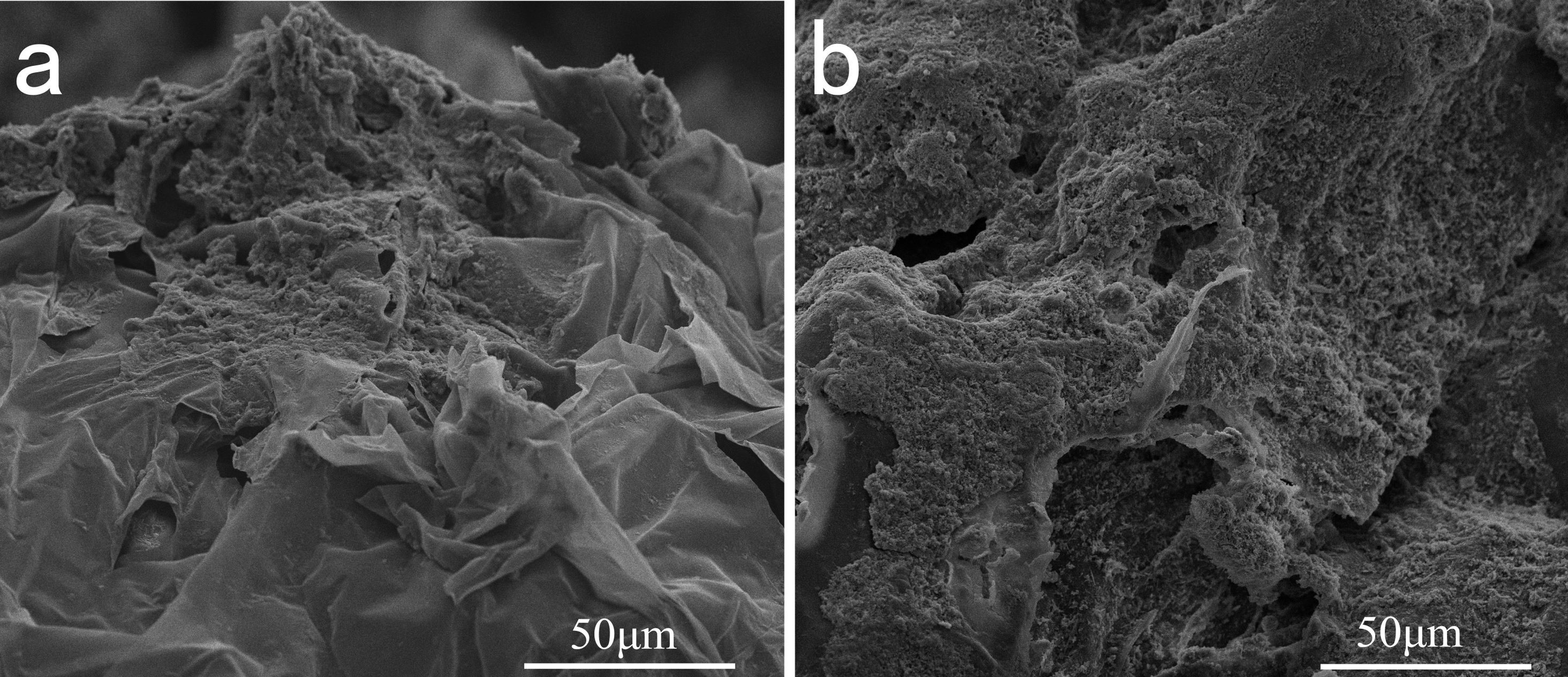 Surface micrographs of the in-situ EPSs observed using SEM. Samples were selected randomly from the collections, (a) surface of the LPs and (b) MPs, respectively.