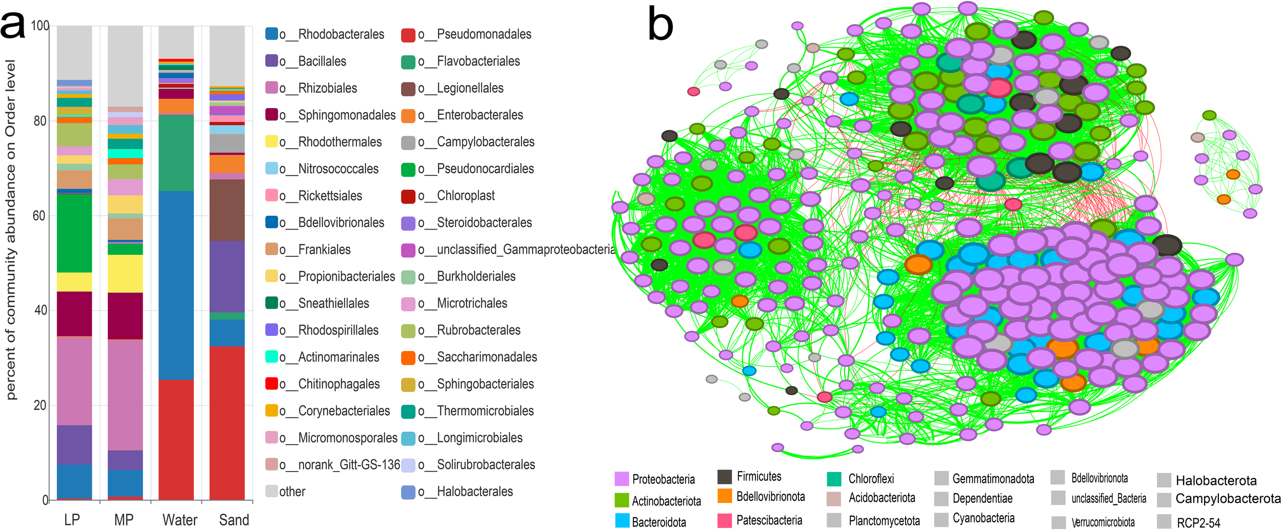 Relative abundance of the original bacterial consortia and the co-occurrence network analysis. (a), The original consortium diversity of the samples of LP, MP, seawater, and surface sand at the order level. (b), Network analysis of all the samples. The color of the nodes displays different dominant phyla. Red lines between nodes represent negative correlations, while green lines indicate positive correlations.