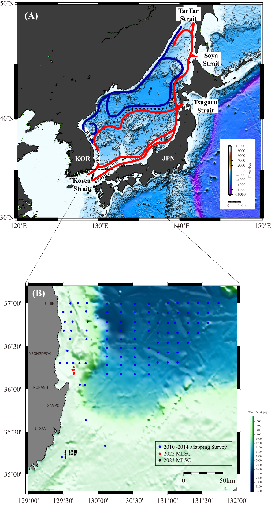 The East Sea (Sea of Japan) is a semi-enclosed marginal sea with an average depth of approximately 1,350 m and a surface area of approximately 1,000,000 km². The Tsushima Warm Current (TWC), a mixture of the warm, saline Kuroshio current and freshwater from the East China Sea Coastal Water (ECSCW), enters the East Sea through the Korea Strait and exits into the Pacific Ocean via the Tsugaru Strait. Upon entering the East Sea, the TWC splits into three distinct branches (Figure 1A).